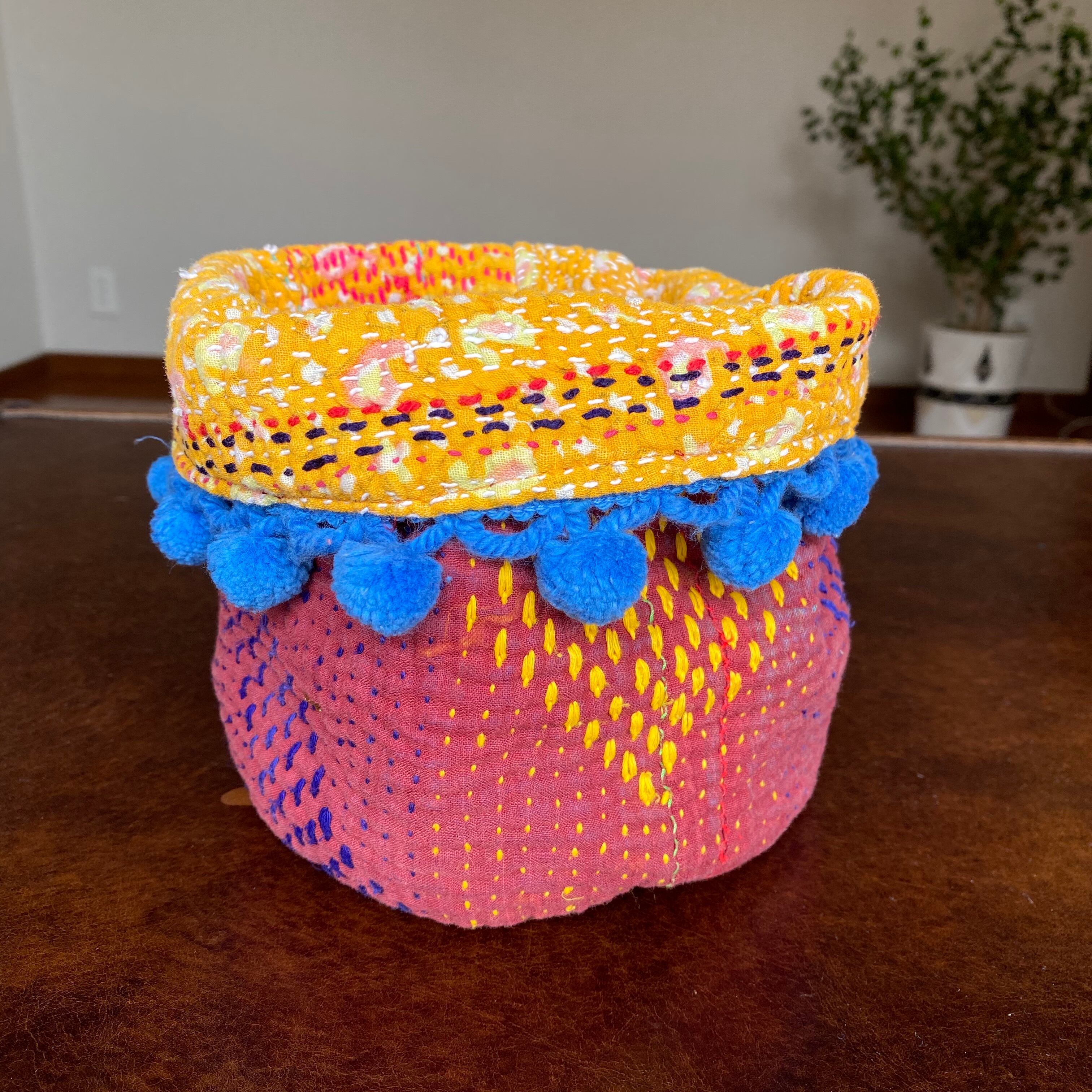ポルトガルの作家さんによってリメイクされた、大変おしゃれな鉢カバーです。ヴィンテージカンタキルトをリメイクして作られています。もちろん小物入れとしても使っていただけます。リバーシブルになっていて、裏返すとガラッと雰囲気が変わります。