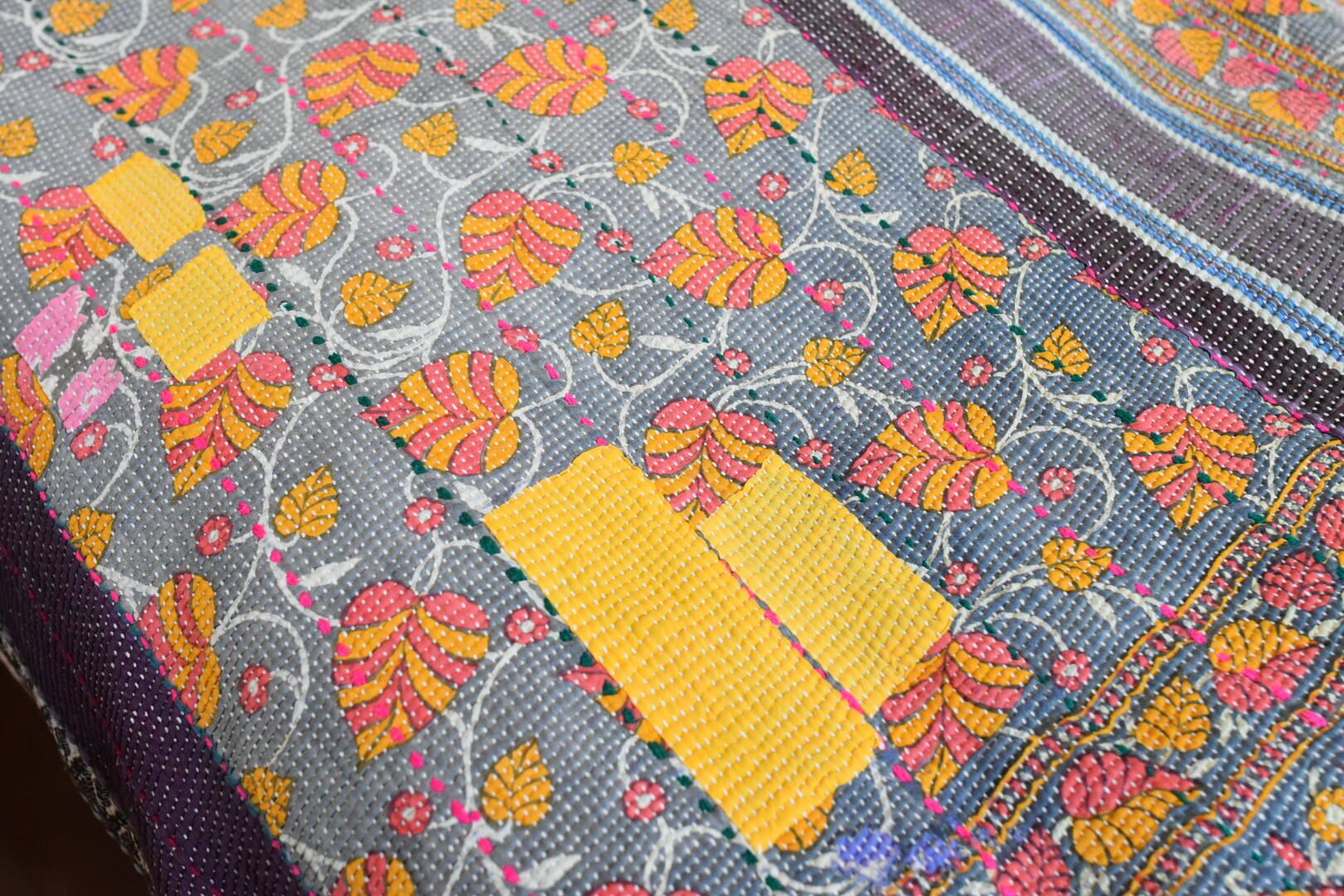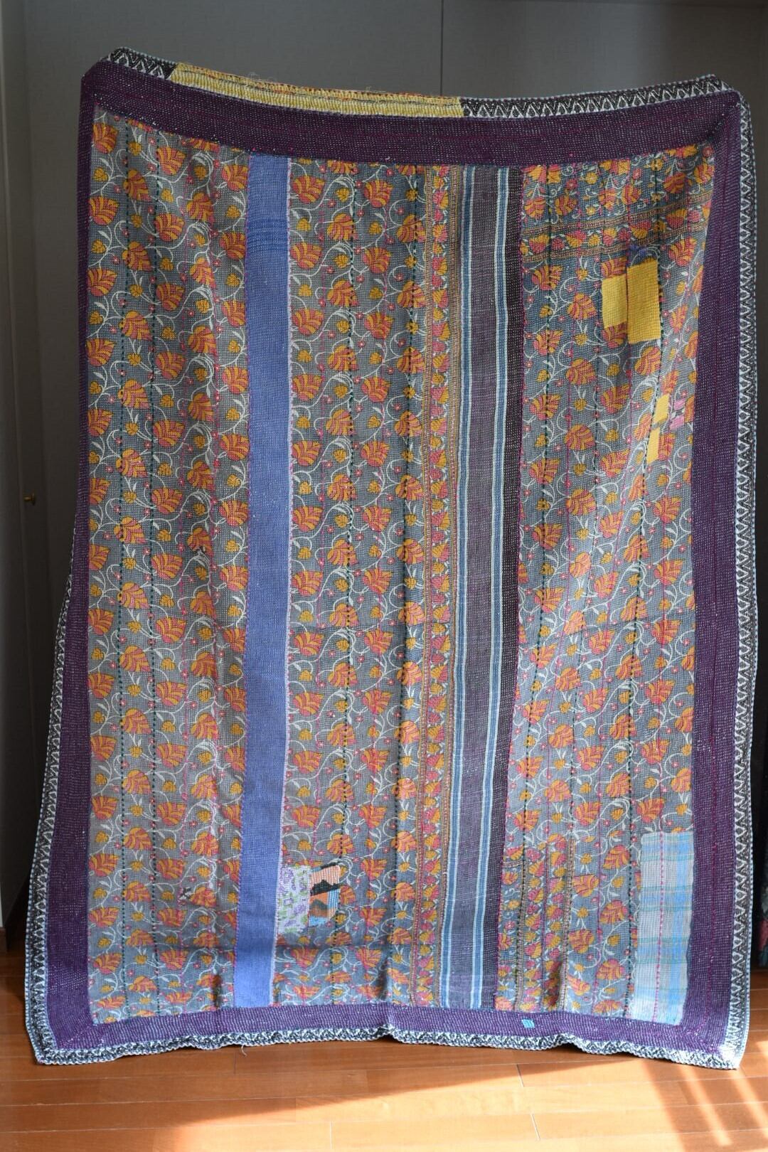 ライトグレーにレトロな葉模様が優しいカンタです。淡いサックスブルーのストライプやピンクとグリーンの太目のステッチは程よくアクセントになっていています。キルトの端には水色のラインと赤いステッチが施されていて、さりげないお洒落にときめきます!全体のランニングステッチはとても細かく手が込んでいるのが分かります。