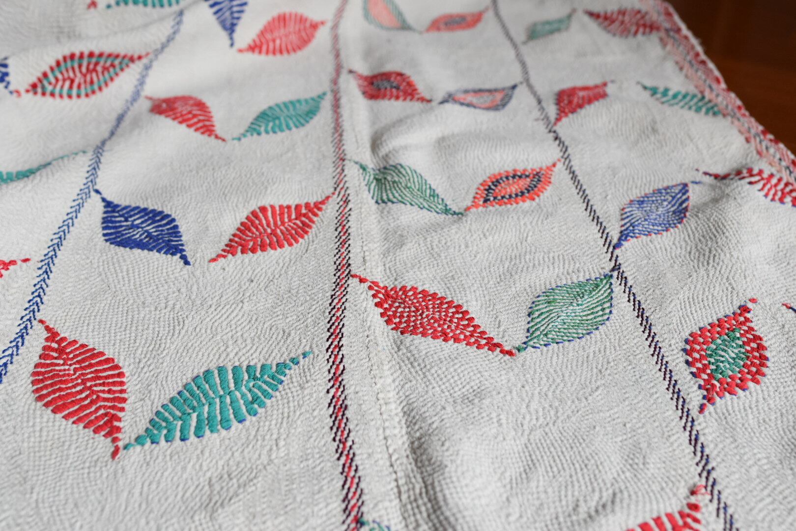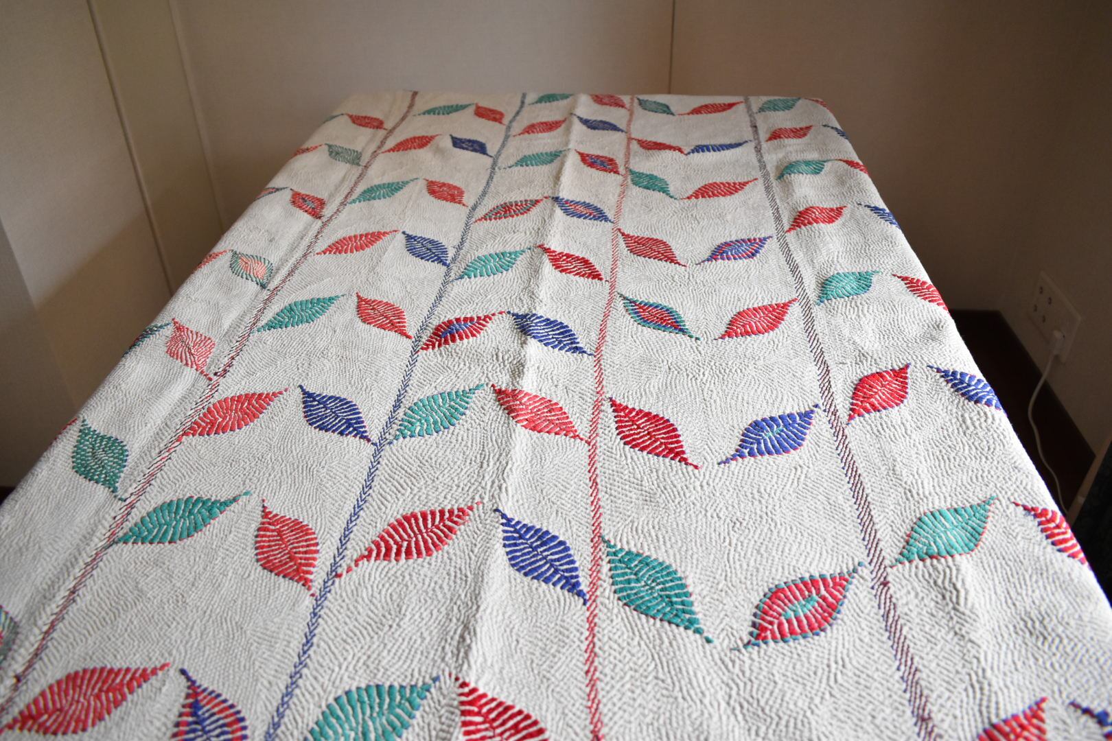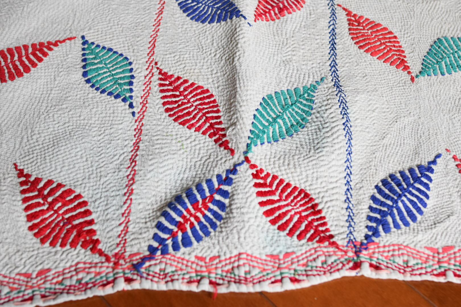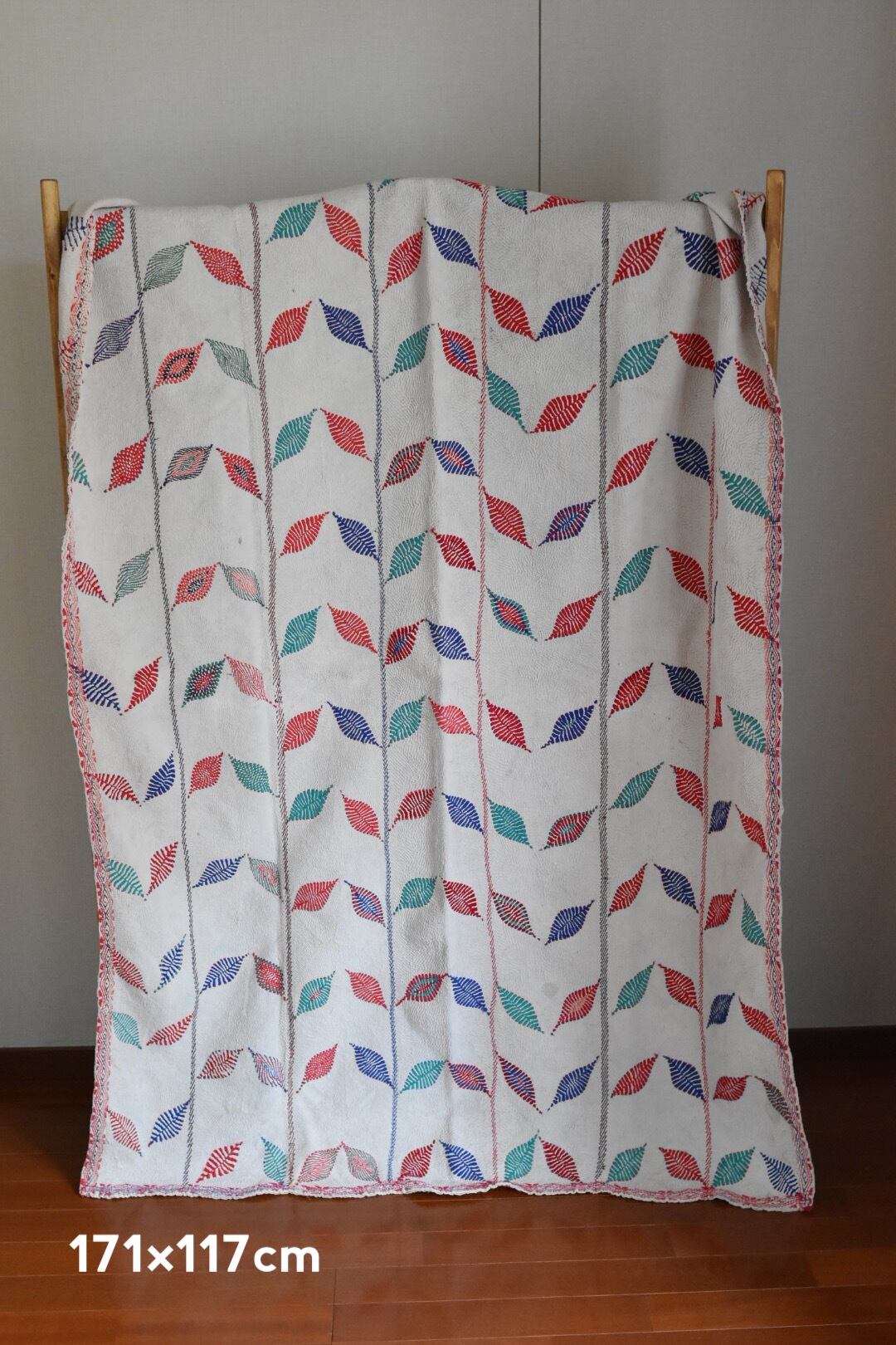 赤い縁がぱっと明るい印象のホワイトカンタです。約10cmの小さな葉の刺繍は、ざっと数えるだけでも140枚。葉一枚一枚にも様々なバリエーションがあり、とても手が込んでいます。裏面の処理もとても丁寧です。赤の使い方が絶妙な一枚です。