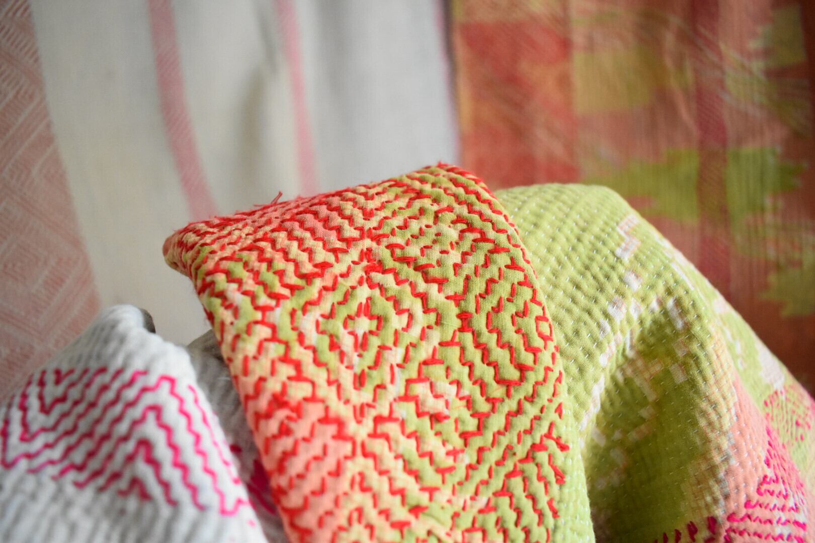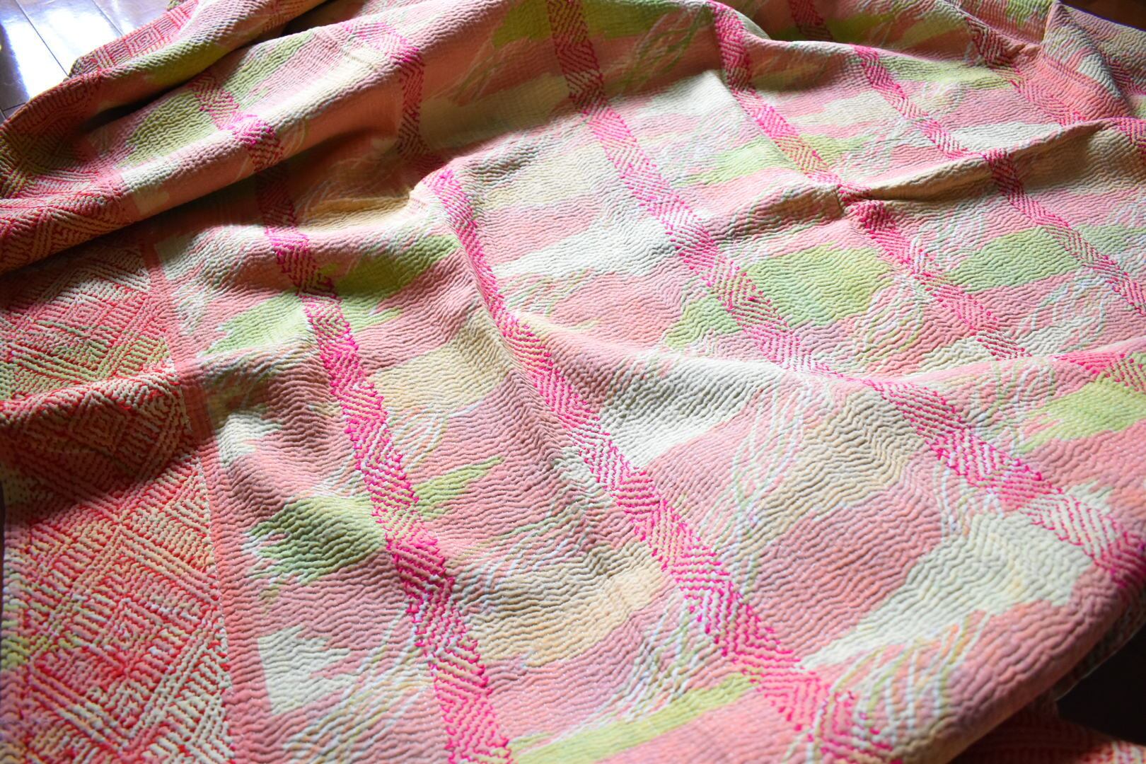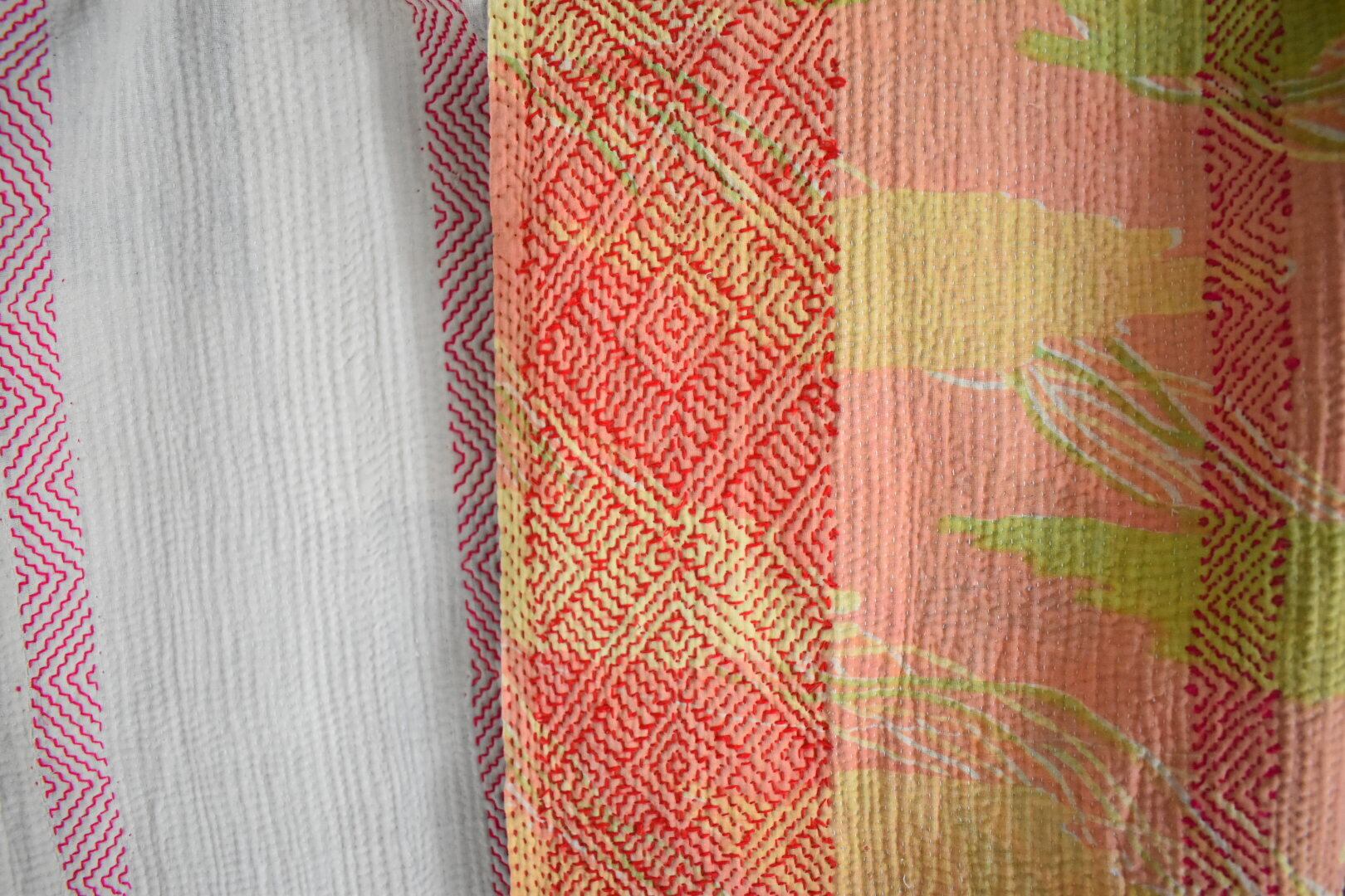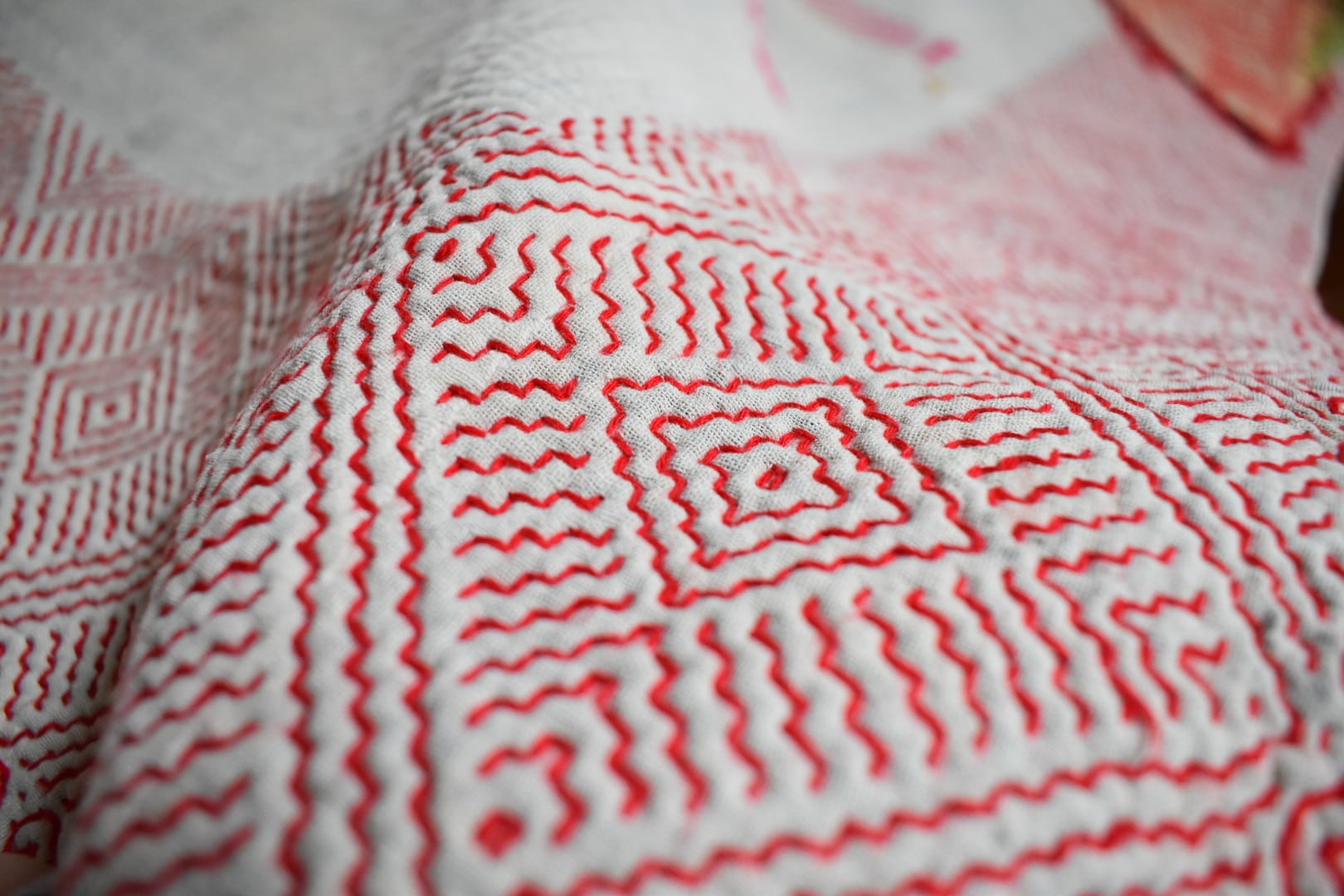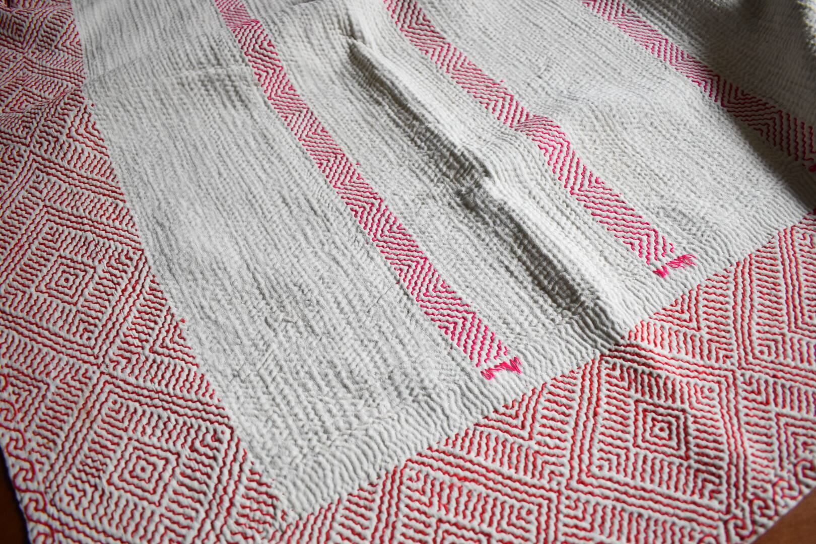 ヴィンテージホワイトに赤いステッチがすっきりと美しいキルトです。縦のラインステッチはピンクの糸で施されていて、とっても軽やか。反対のサーモンピンクの面とも相性バッチリです。中にサンドされている青い布がチラッとのぞく箇所があり、これからどんな風に表情が変わっていくのか見るのも楽しみですね。