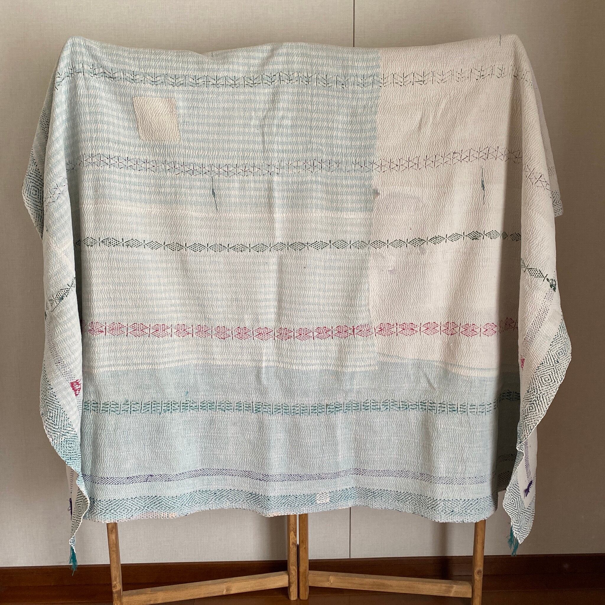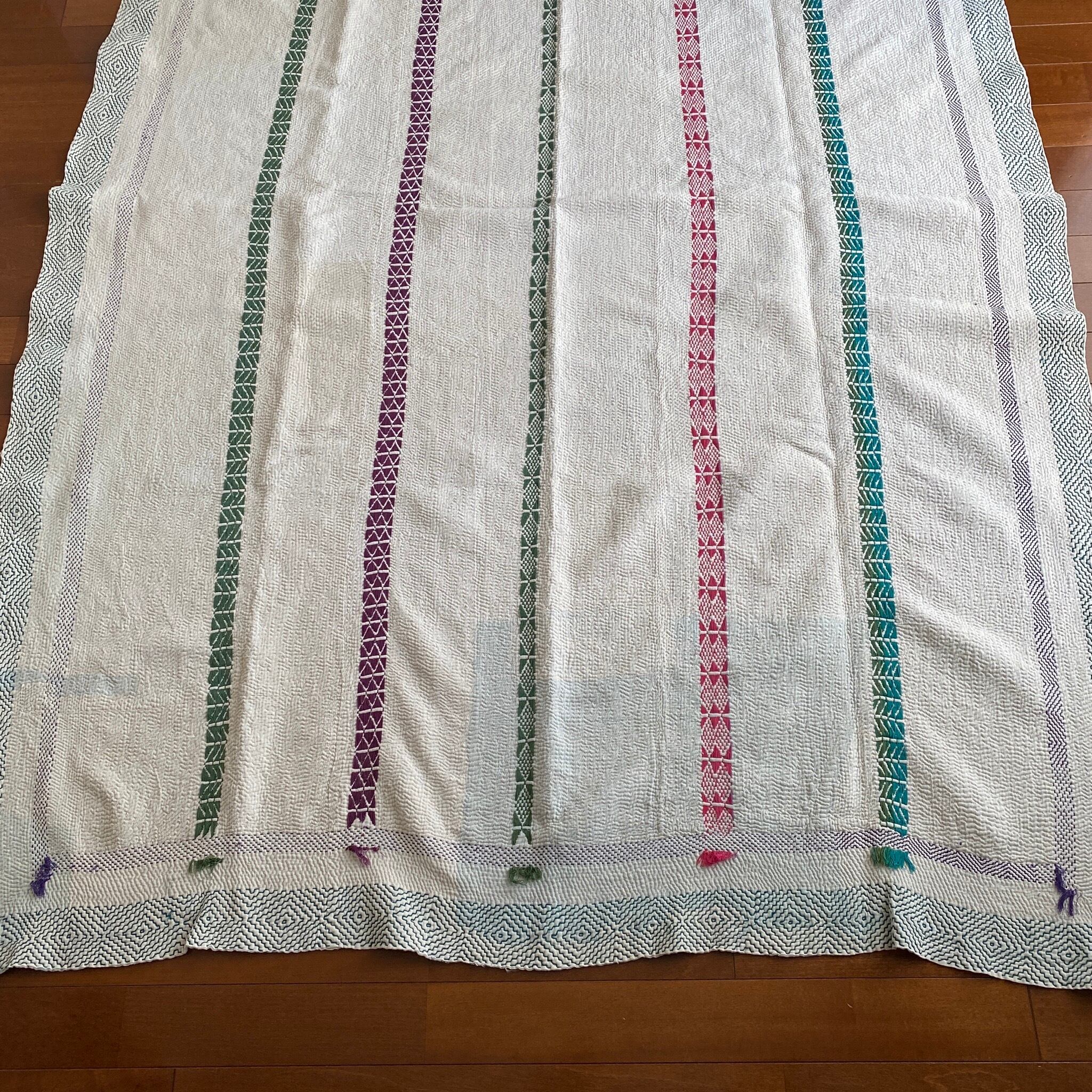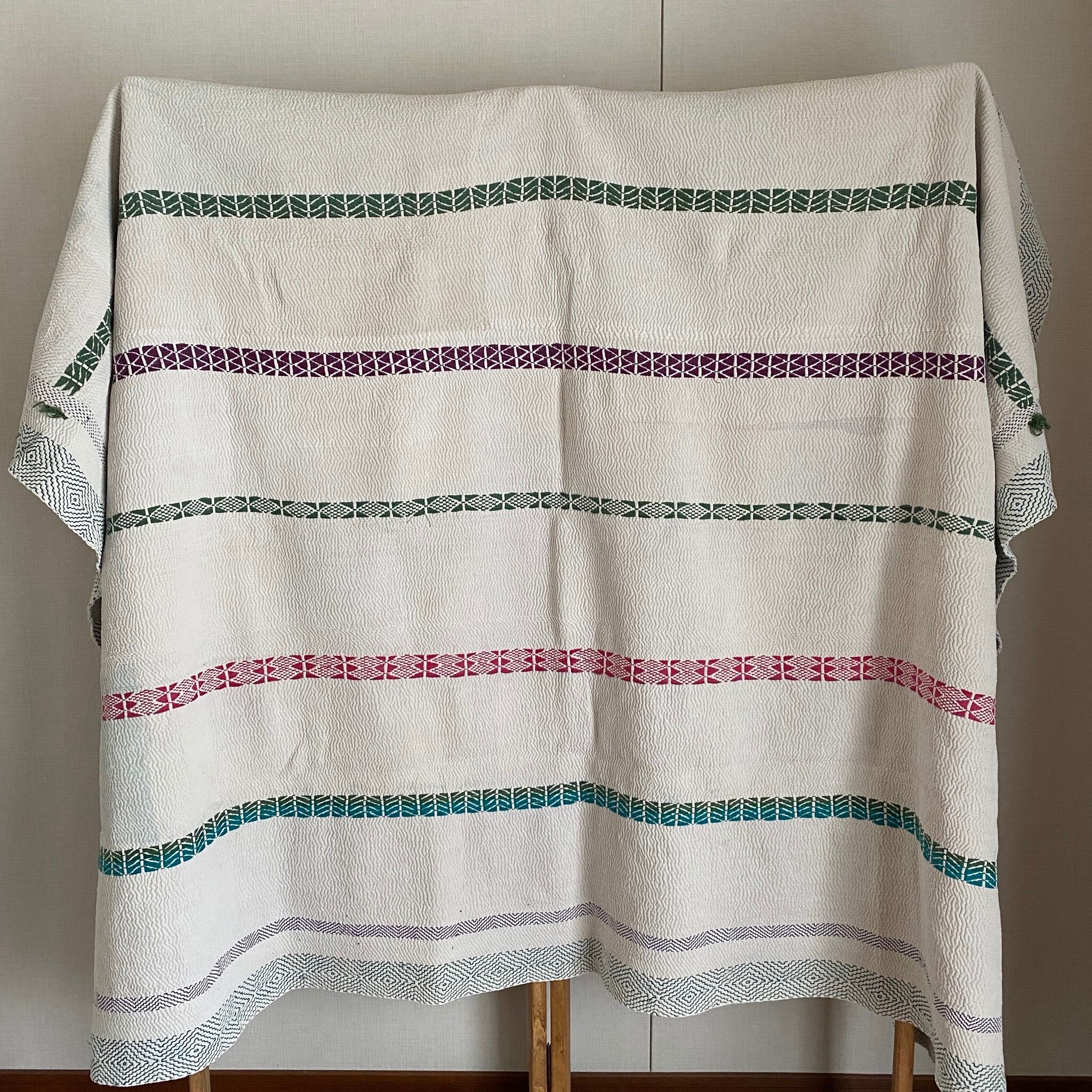 アースカラーの緑、紫、ピンクのライン刺繍が素敵なヴィンテージホワイト。大人っぽく素朴な雰囲気の一枚です。珍しい色合いで、プリミティブな雰囲気のお部屋におすすめです。細かいランニングステッチが美しく波打ち、肌触りがとても良いです。