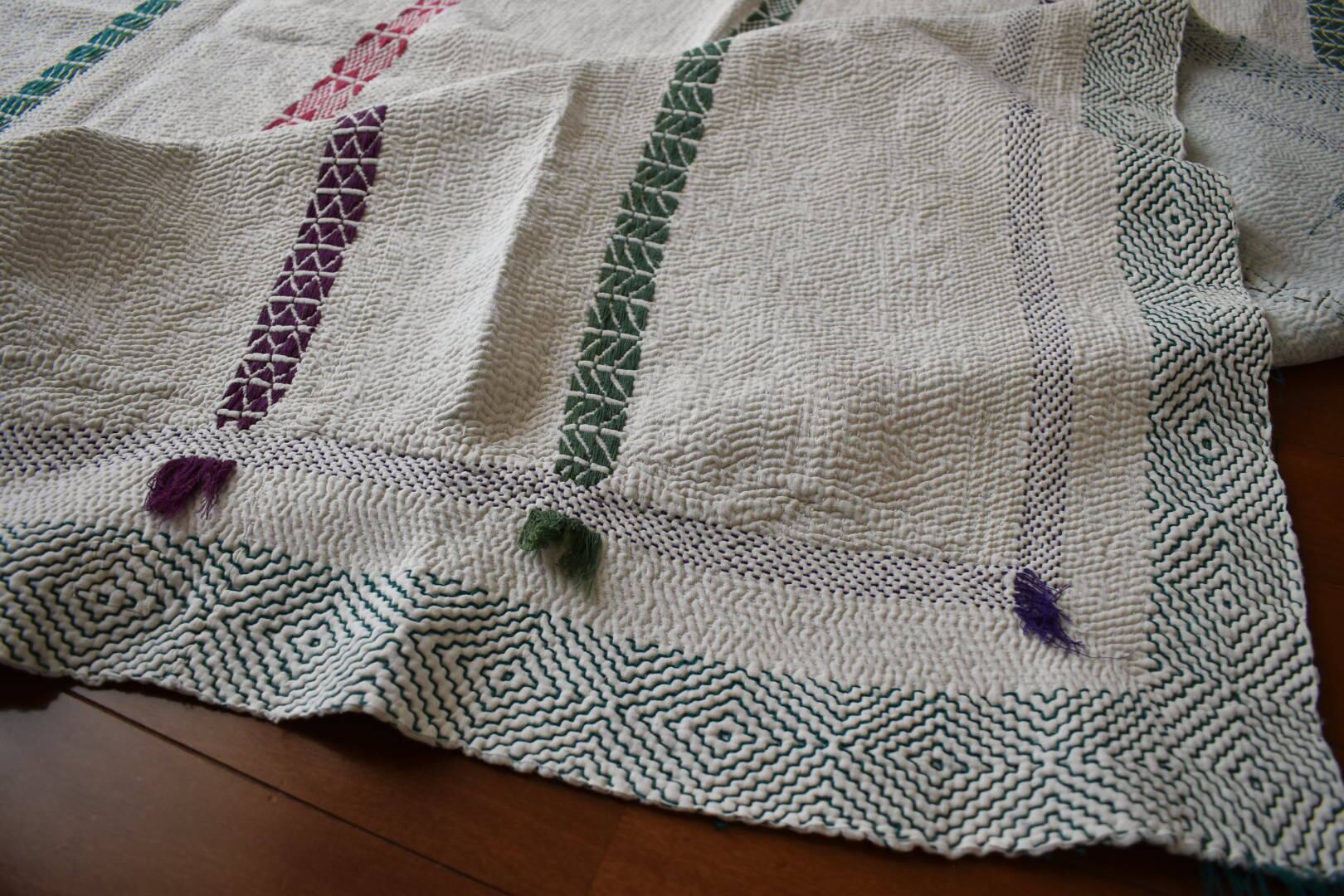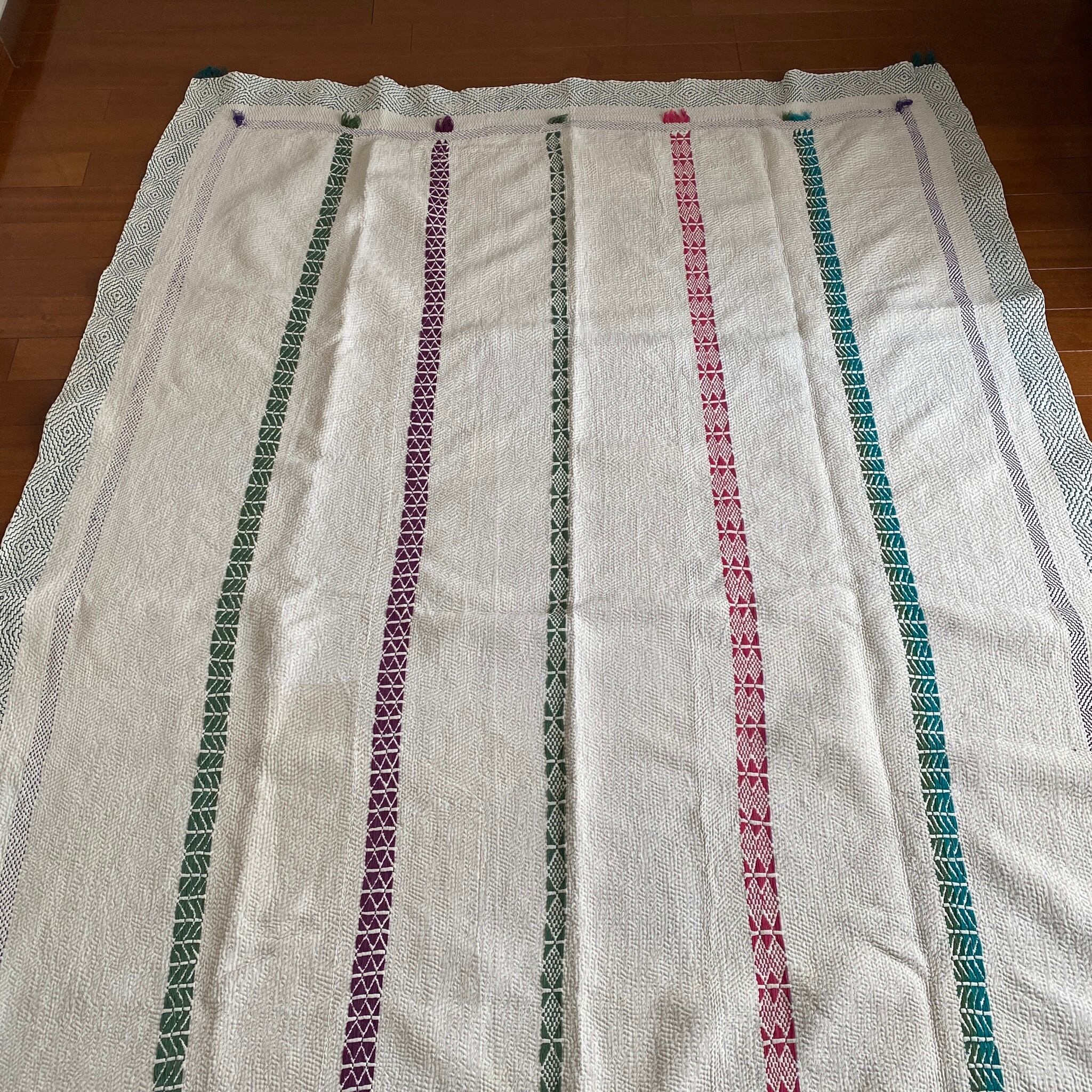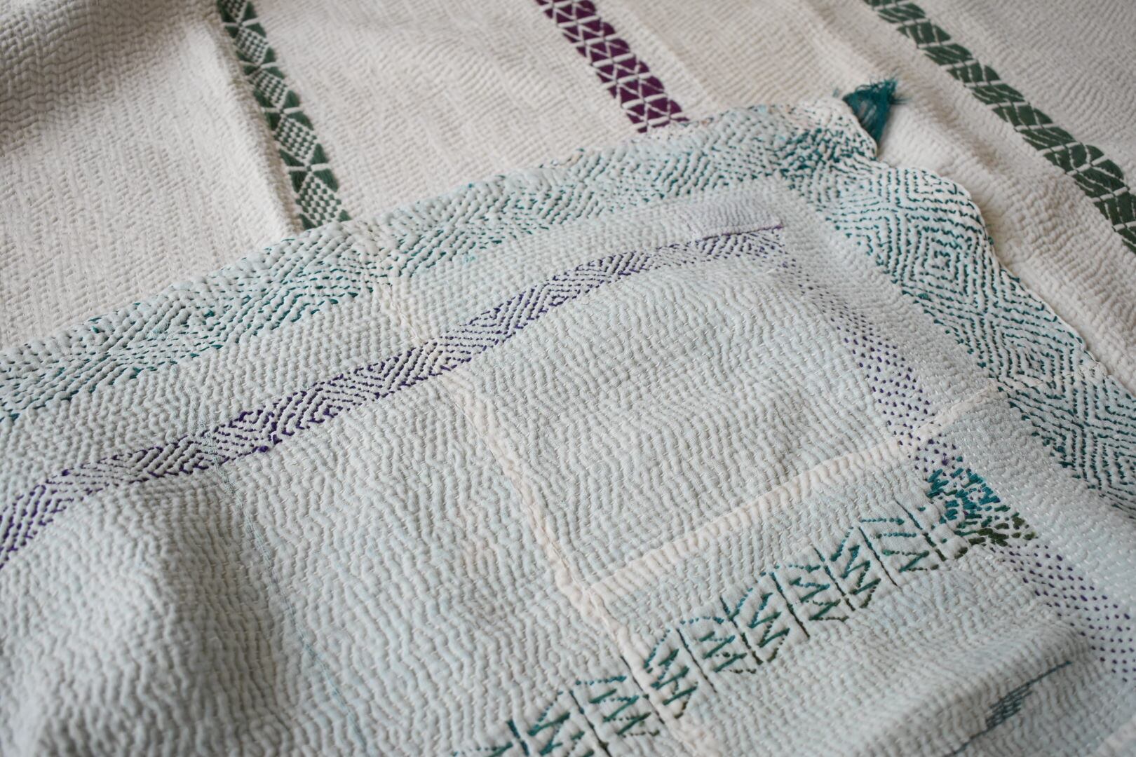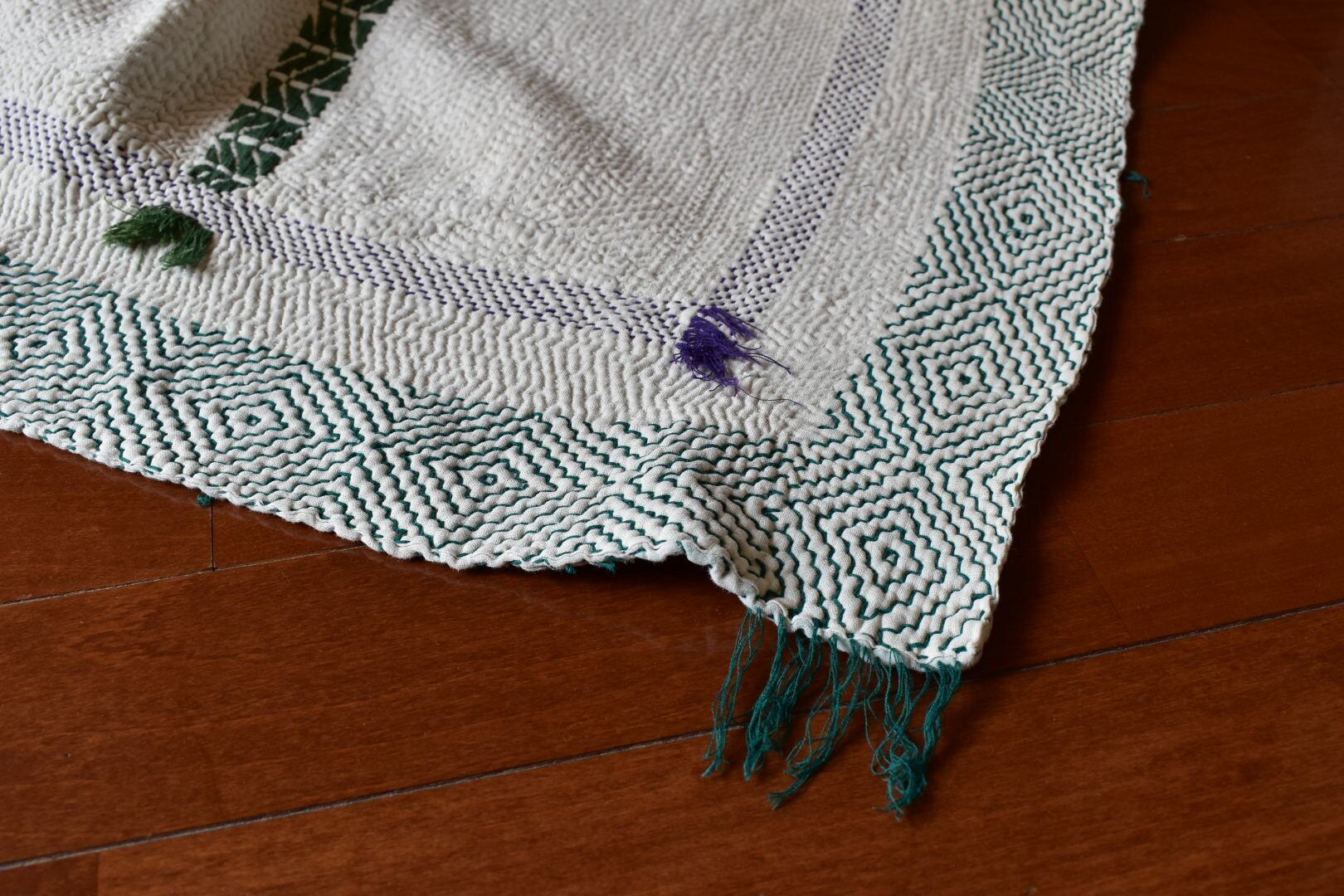 アースカラーの緑、紫、ピンクのライン刺繍が素敵なヴィンテージホワイト。大人っぽく素朴な雰囲気の一枚です。珍しい色合いで、プリミティブな雰囲気のお部屋におすすめです。細かいランニングステッチが美しく波打ち、肌触りがとても良いです。