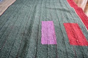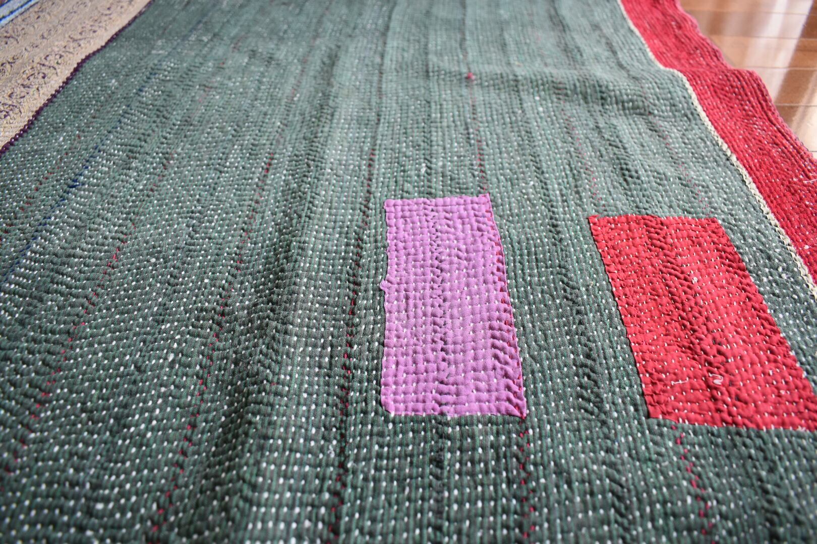 クリーム色に優しい黄緑、その上にかわいいバラ。白っぽい中に、ふわっとピンクに色づく花弁は、まるでピエール・ド・ロンサールのよう。中央に走る水色のラインは、爽やかなアクセントになっています。フレンチな雰囲気が漂う珍しい柄のカンタキルトです。反対の面は、彩度を控えたピンク、グリーン、赤。ポップなパッチが少しにぎやかですが、表裏のギャップを楽しめる一枚です。