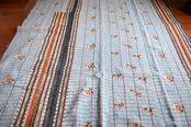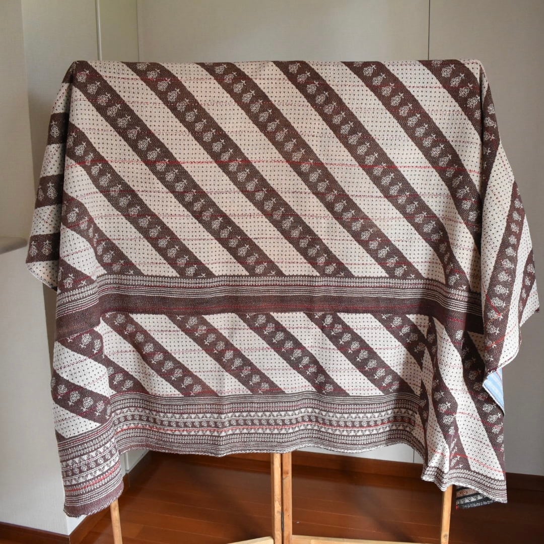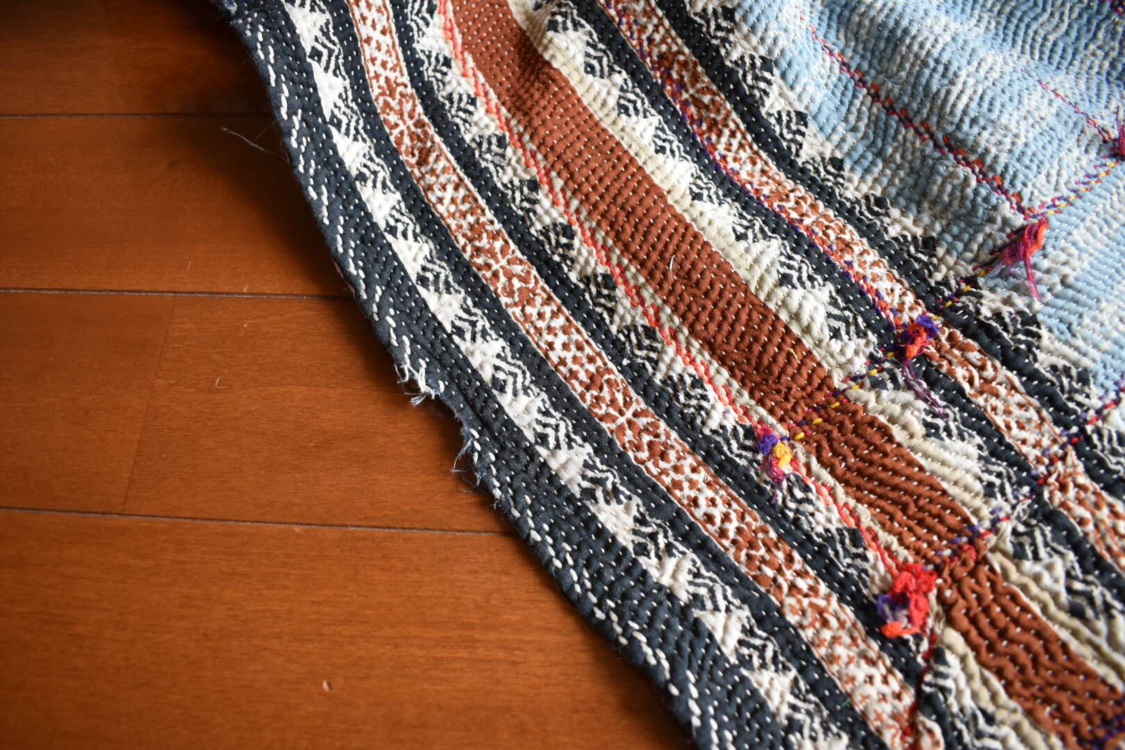 爽やかな水色にアプリコット色のオールドローズがプリントされた、珍しいカンタキルトです。黒×茶×白のストライプはふんわりした印象のキルトをキュッと引き締め、さりげなく施された赤いライン刺繍がアクセントになっています。反対の面は茶×白のシンプルで落ち着いた印象です。水色との相性も良いですね。