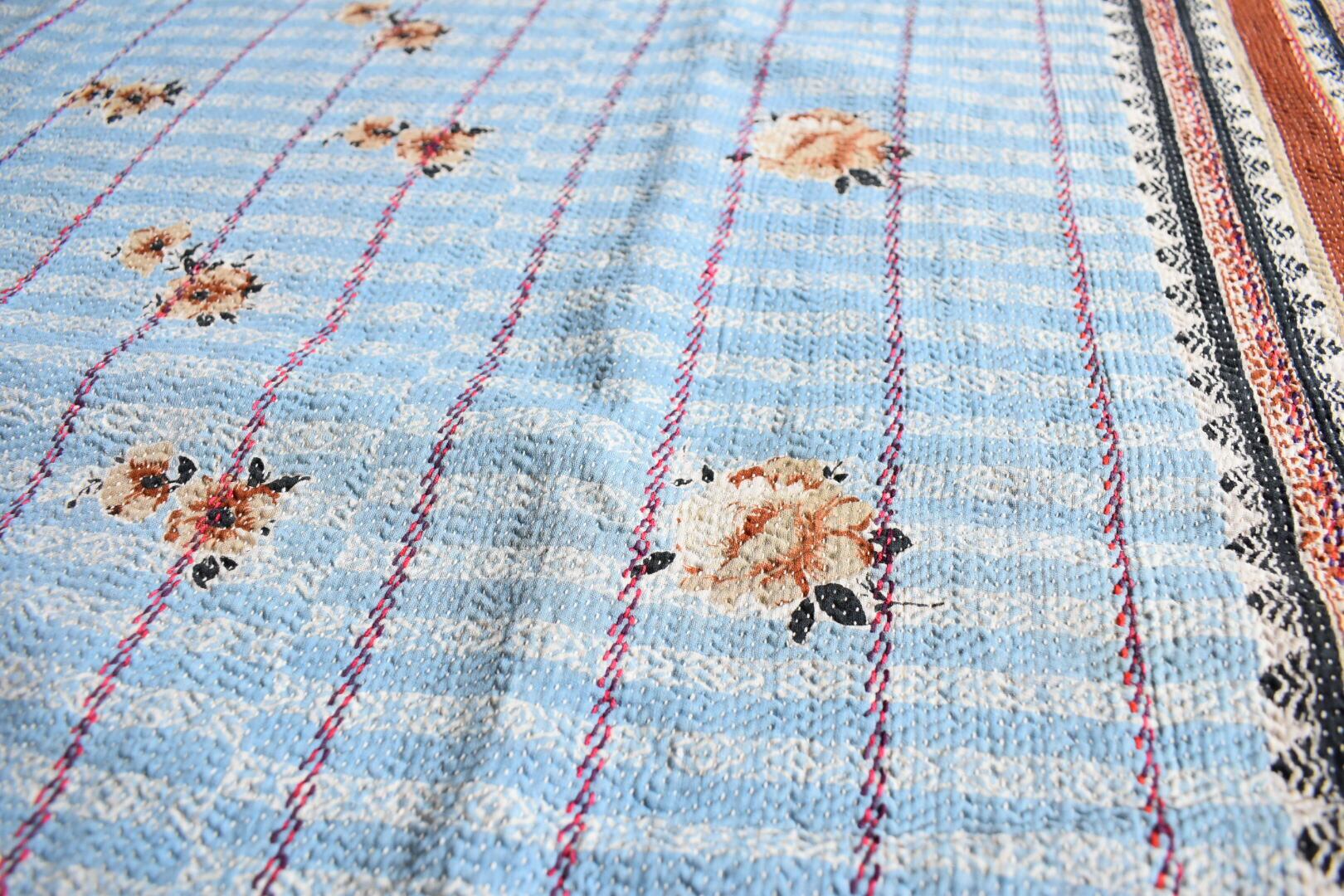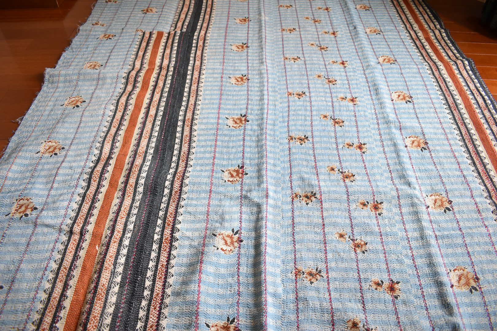 爽やかな水色に優しいオールドローズ柄 ヴィンテージカンタキルト