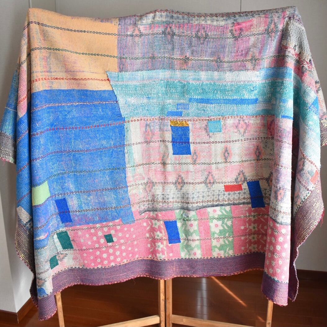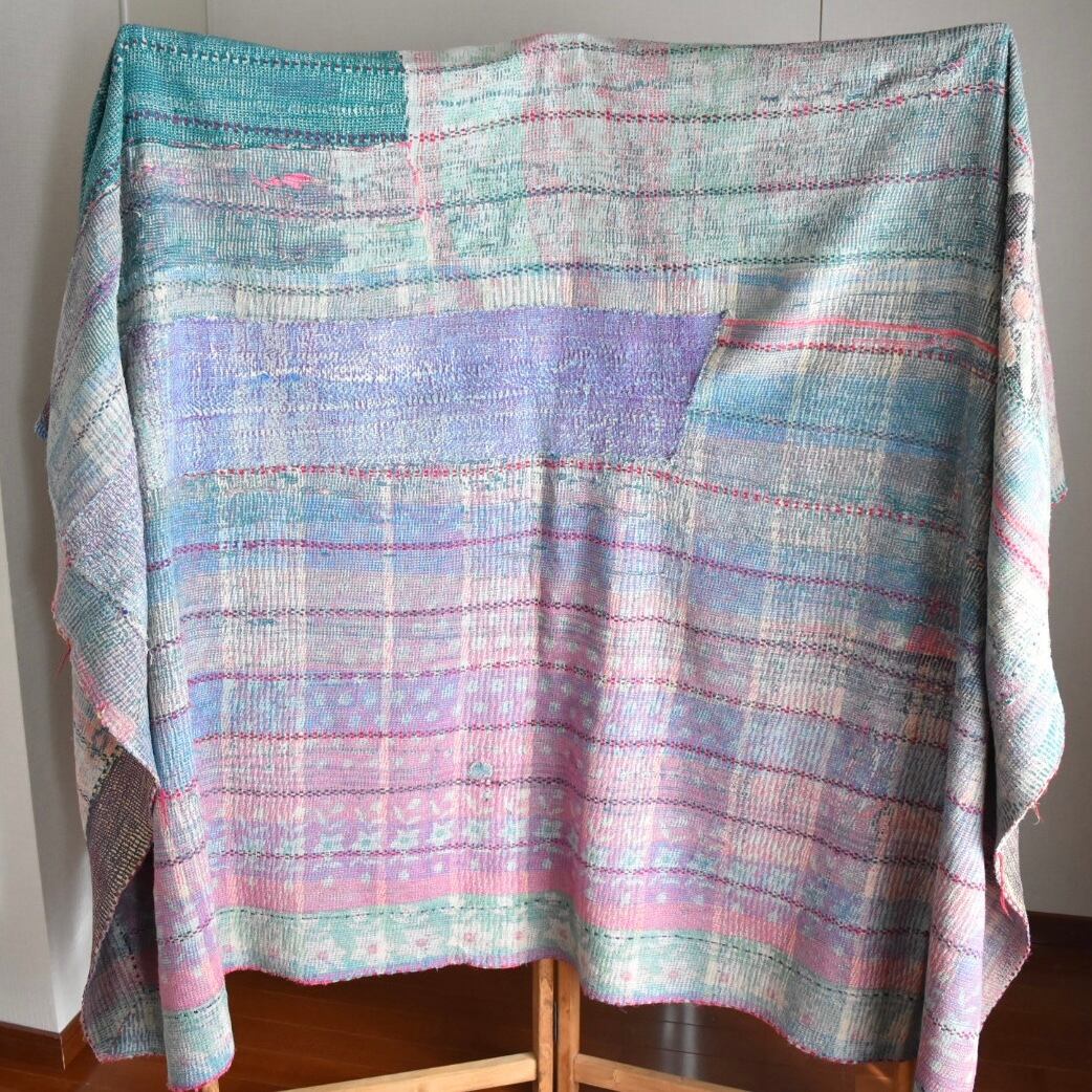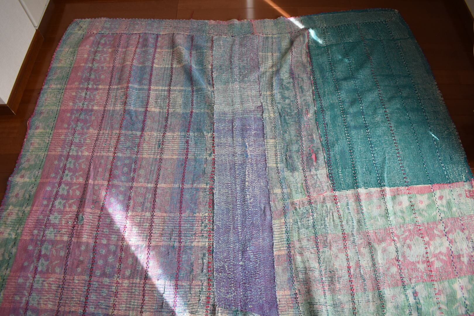 優しい色のグラデーション、何層にも重なる色。くたっと柔らかく、色彩豊かなキルトは変幻自在です。気になる穴はありませんが、部分的に薄くなっている個所があります。リメイクなどでカンタを使用される方にもおススメです。