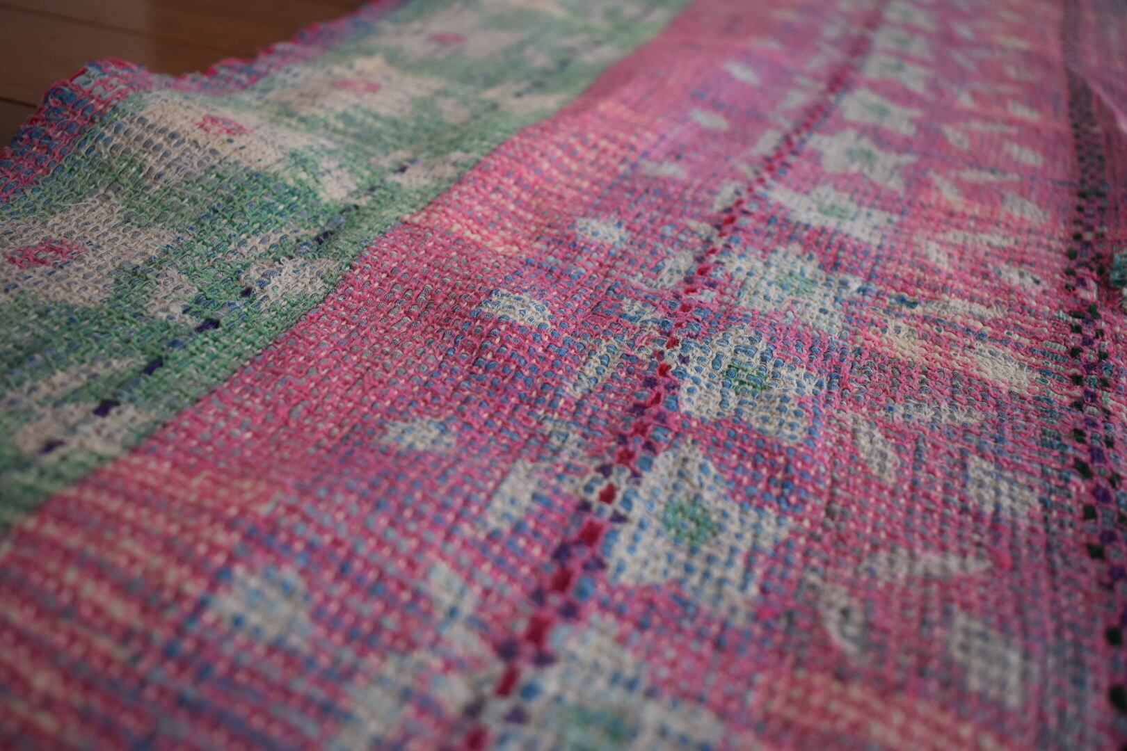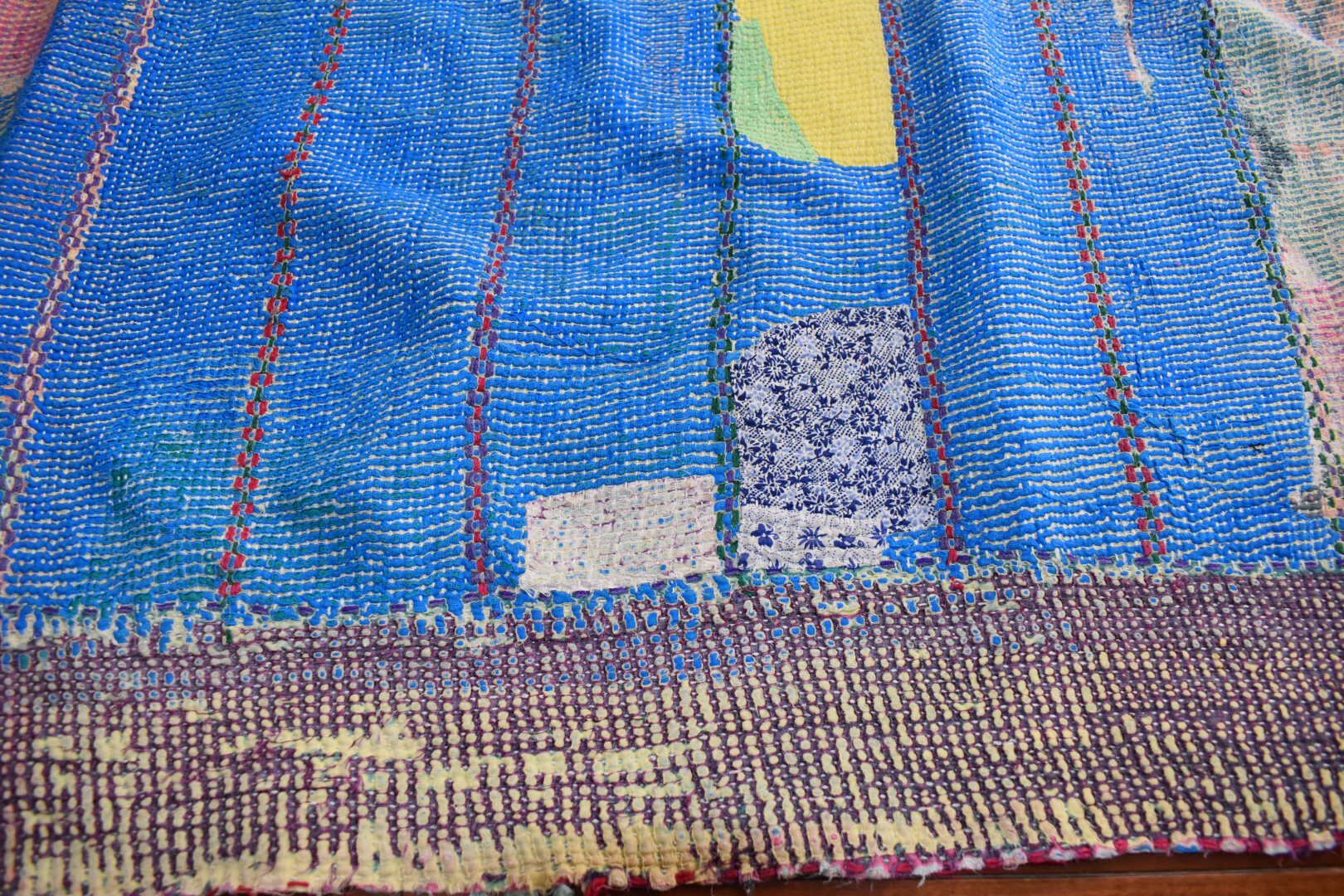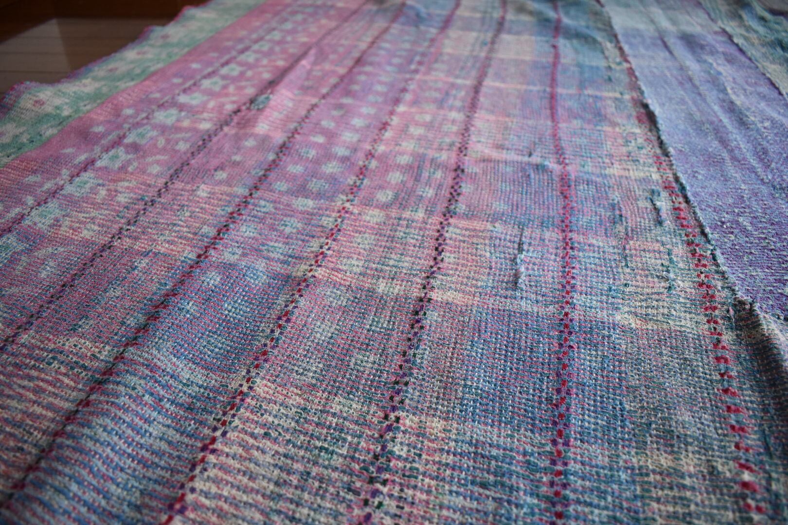 優しい色のグラデーション、何層にも重なる色。くたっと柔らかく、色彩豊かなキルトは変幻自在です。気になる穴はありませんが、部分的に薄くなっている個所があります。リメイクなどでカンタを使用される方にもおススメです。