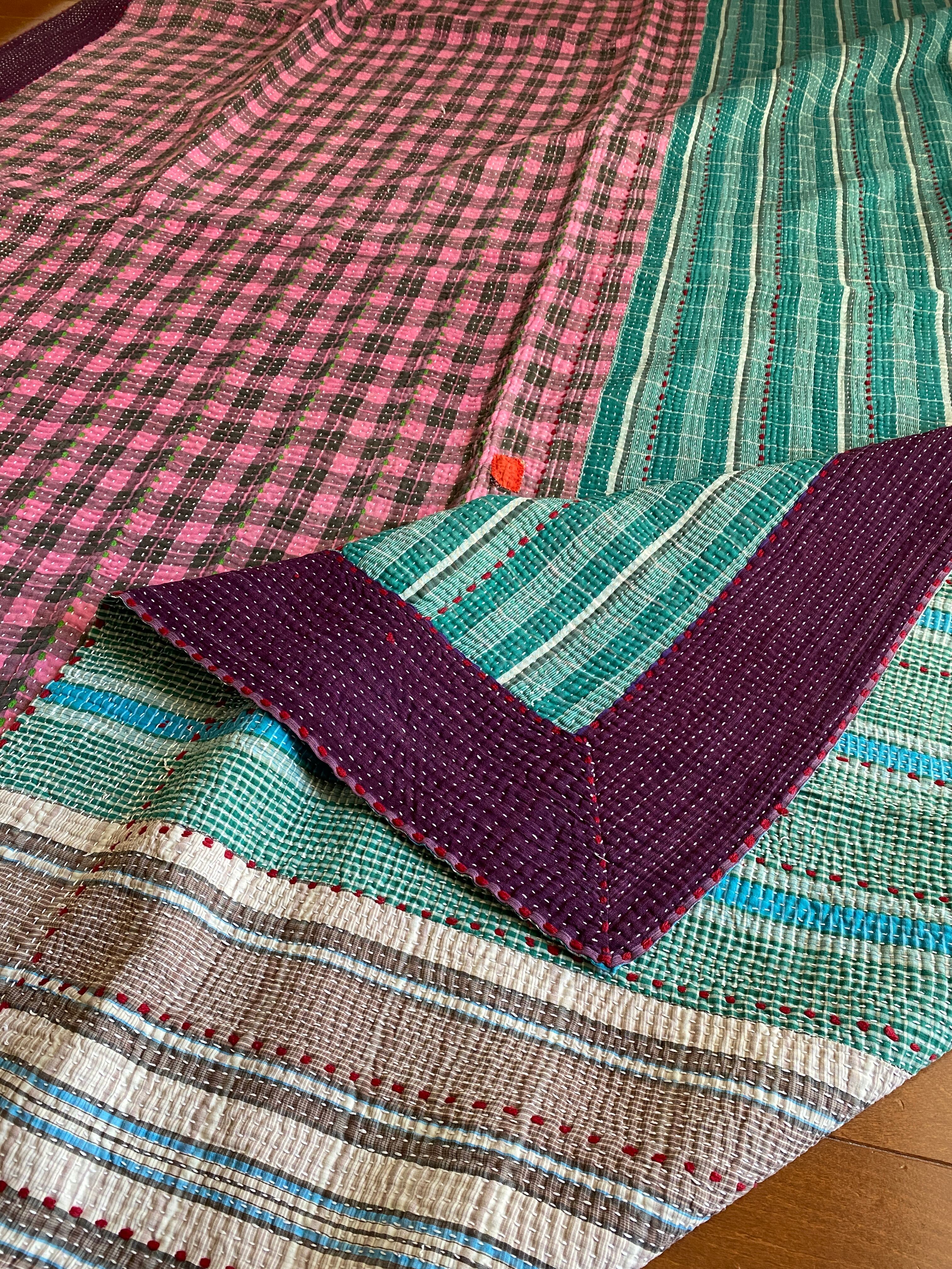 ピンク×黒のポップなチェックに、緑と白の爽やかなチェック。黄緑や赤のアクセントステッチが効いていてオシャレです。パープルの落ち着いた縁が、大人っぽく引き締めてくれています。ランニングステッチやパッチはとても丁寧に施されています。キルトの状態も大変良好です。