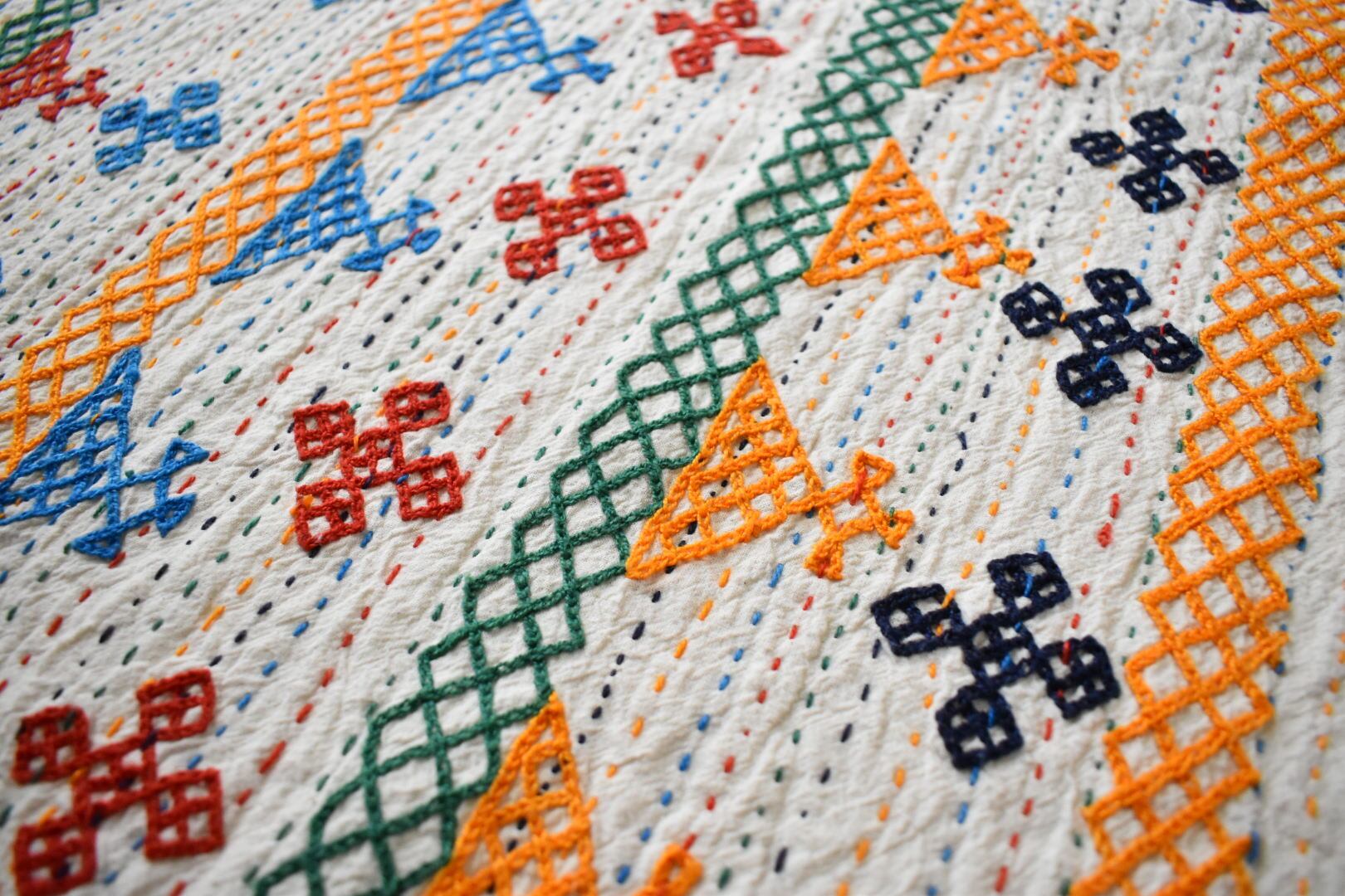 パキスタン、インド等を遊牧するサミ(サーミ)と呼ばれる人たちによって作られたキルトです。カラフルな刺繍はすべてチェーンステッチで施されており、手が込んでいます。少しぷっくりとしていて愛らしいですね。