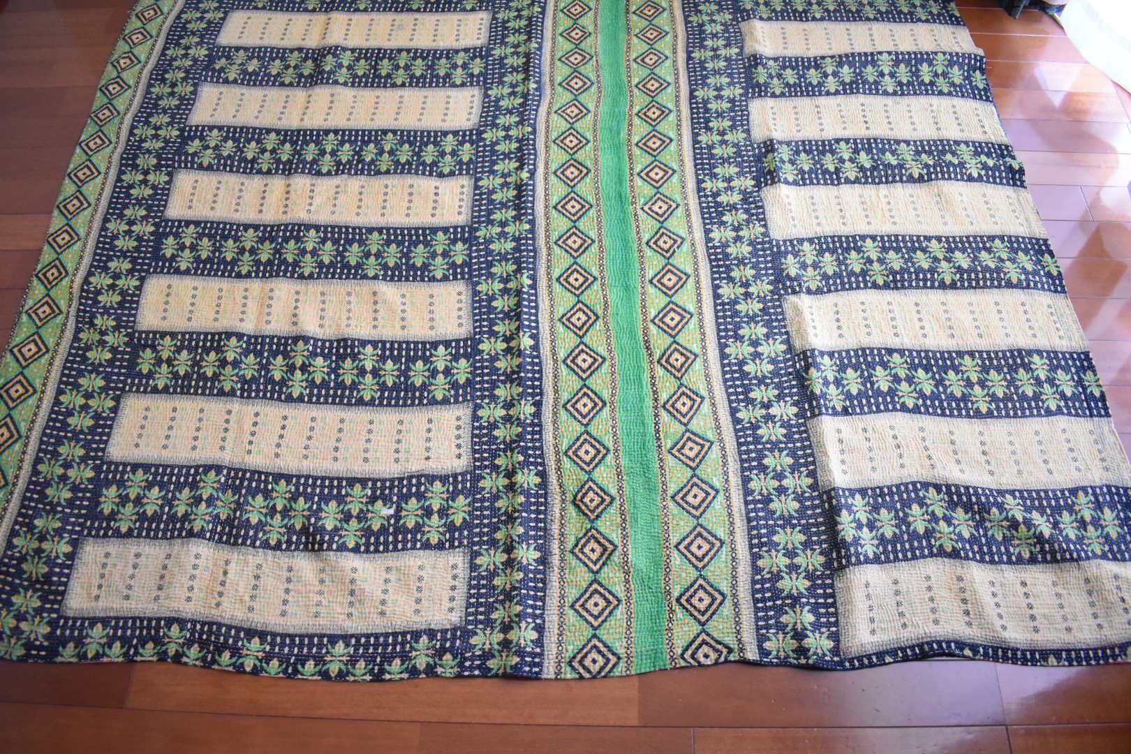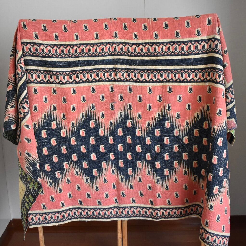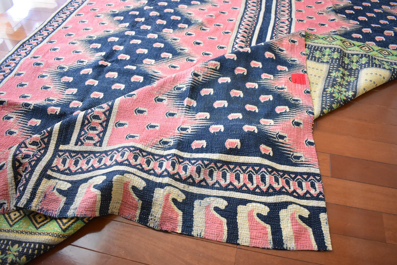 南国のようなフレッシュグリーンと、サーモンピンク×ブラック。レトロなプリントが素敵なヴィンテージカンタキルトです。細糸で施されたランニングステッチはとても繊細・丁寧です。薄手でひらりと軽く、とても扱いやすいキルトです。