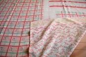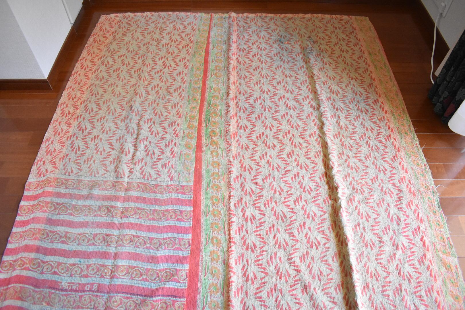 やさしいビスク色に、サーモンピンクのプリントがほんわかと可愛いキルトです。赤糸で施されたランニングステッチもこっそりおしゃれです。大判で、軽やかな薄手のカンタです。