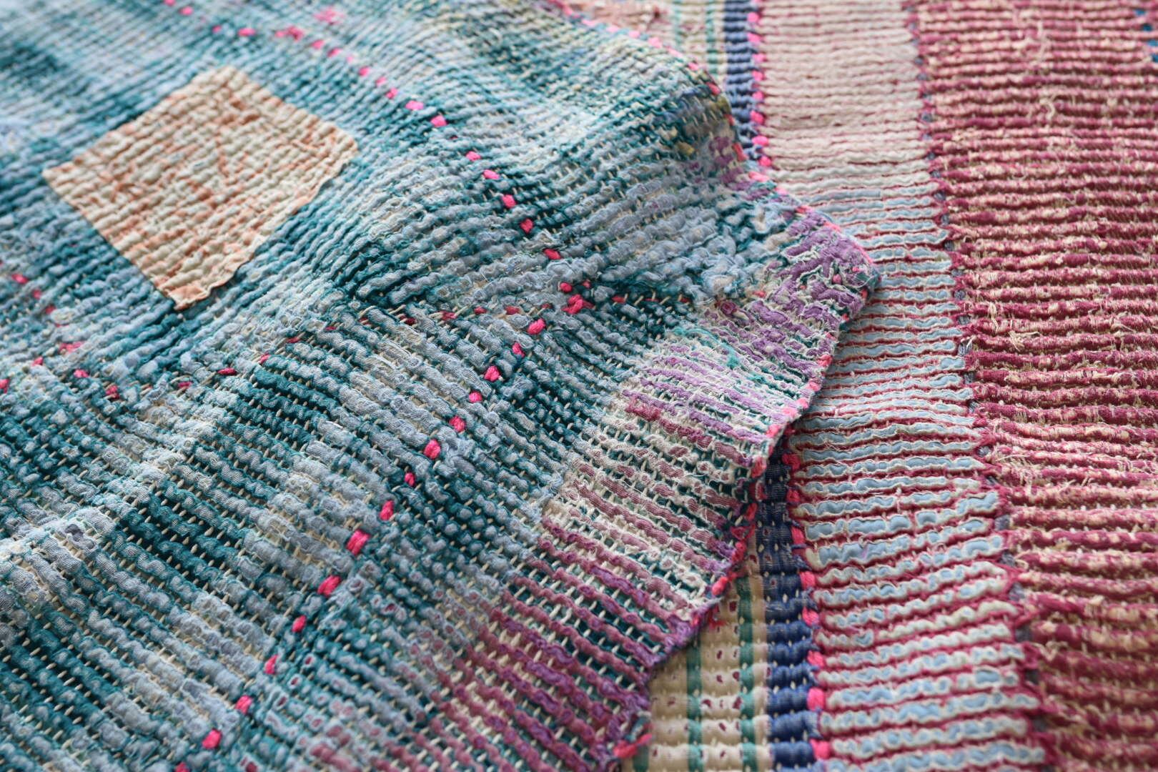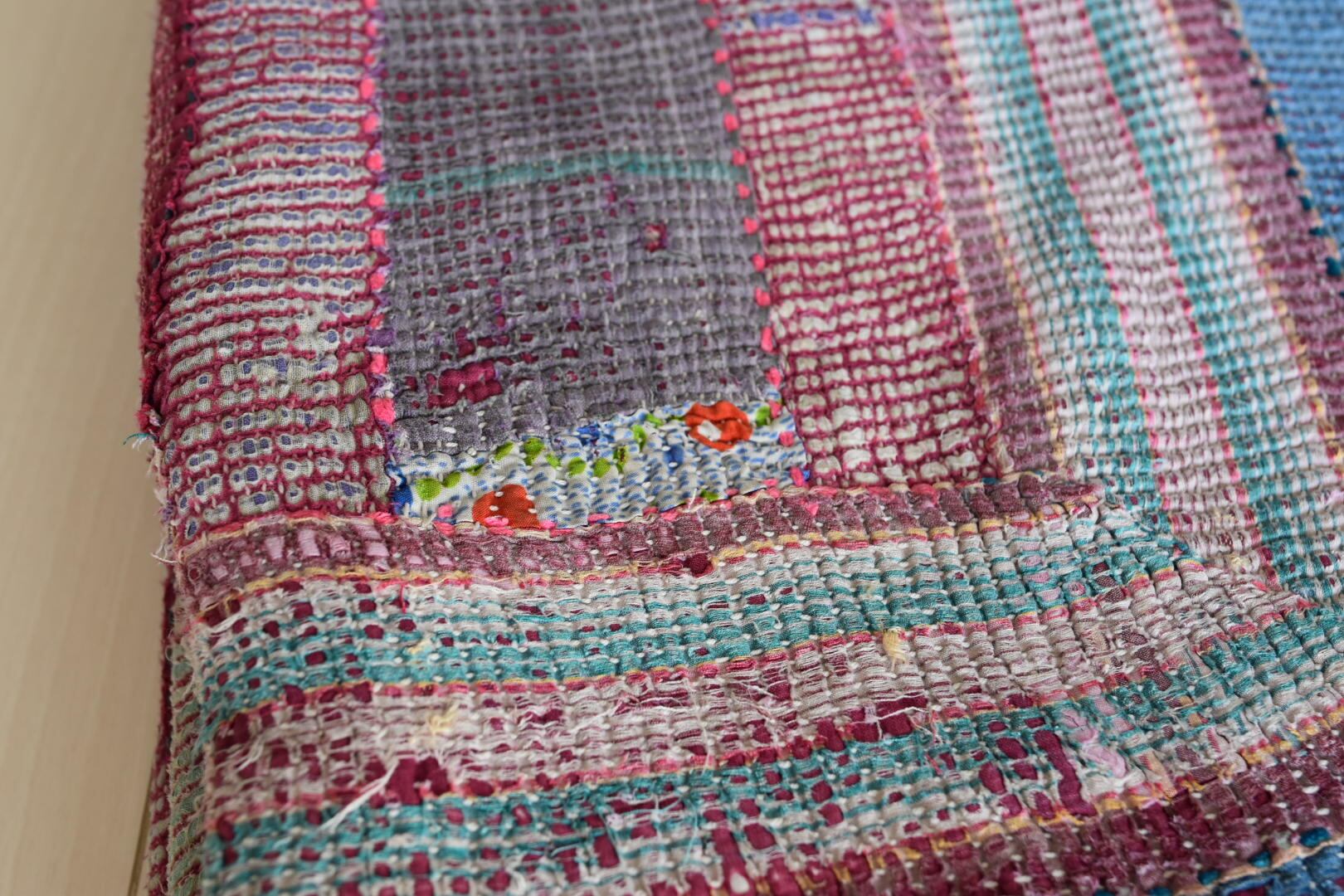 擦れ感がとってもおしゃれなヴィンテージカンタキルトです。全体的に霧がかかったようなスモーキーで落ち着いた色味。摩耗された表面はくたっと柔らかく、下の生地色が透けて見えて味わい深い一枚です。厚めの生地になりますので、ソファカバーやラグとしてご活用いただけます。