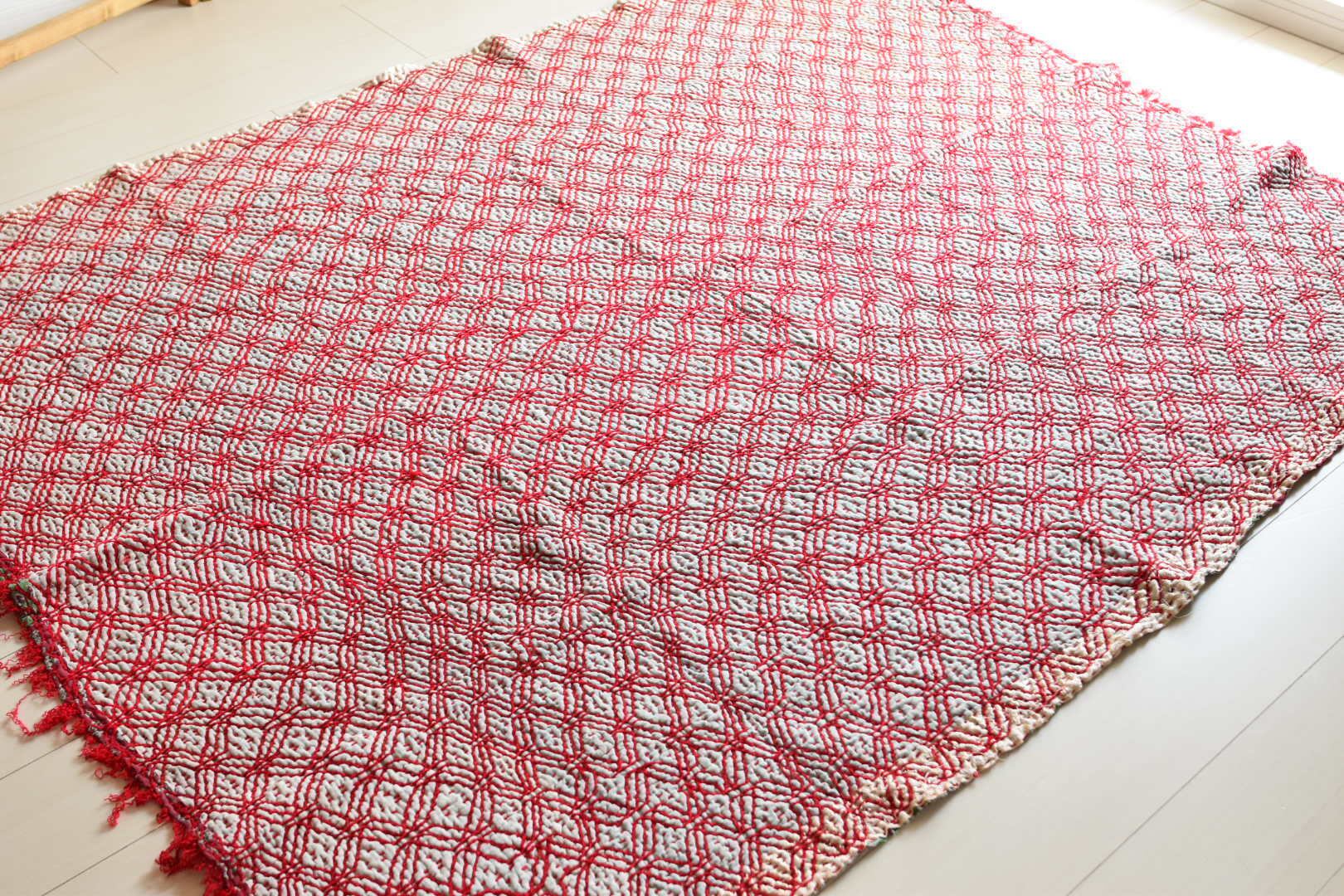 真っ赤な毛糸で珍しい模様のステッチが全面に施されています。裏面のブロックプリントもおしゃれで可愛い!厚めのぷっくりとしたキルトです。