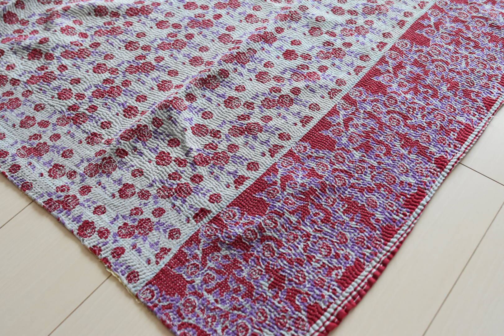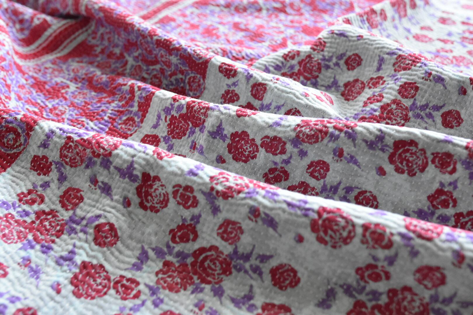 カンタキルトには珍しくバラがプリントされています。直径2cmほどのミニバラが、キルト一面にちりばめられていて、とてもキュートです。反対の面はガラリと雰囲気が変わり、和な感じで楽しいキルトです。薄手でふわっと柔らかく、肌触りの良い一枚です。