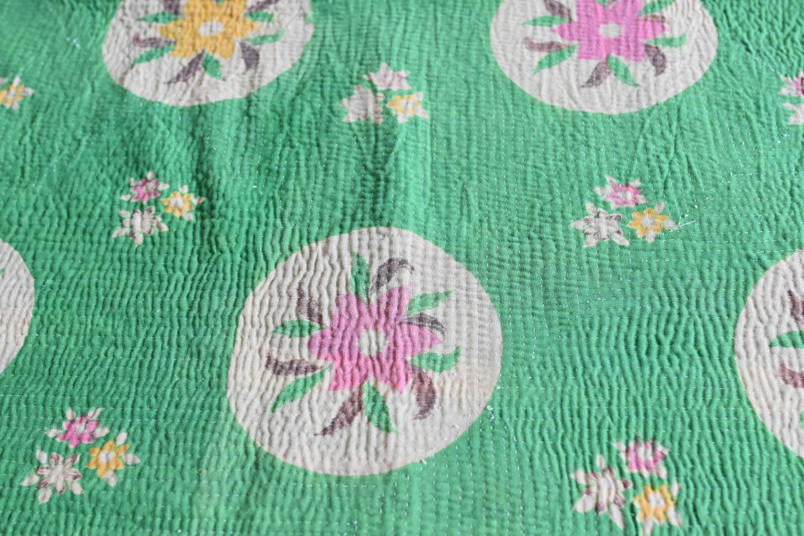 若葉色に白い手毬が浮かぶレトロな花柄 ヴィンテージカンタキル