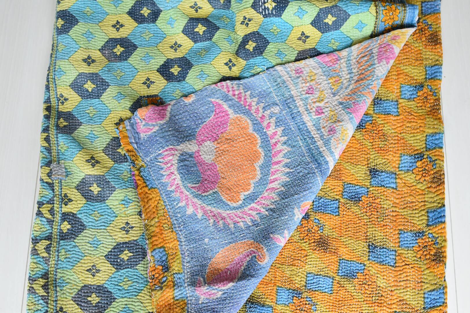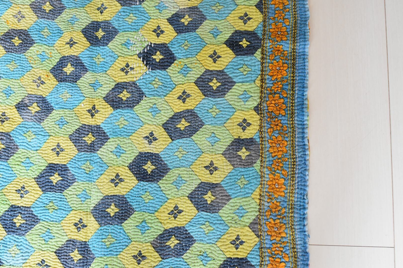 トーン控えめのアイスブルーとレトロポップな亀甲文様が素敵な一枚です。縁にそれぞれ違うキルトが使われていて、カンタらしい一枚です。反対の面は黄色と水色のコンビネーションが懐かしい雰囲気です。厚めでしっかりしているのでラグ等に向いています。