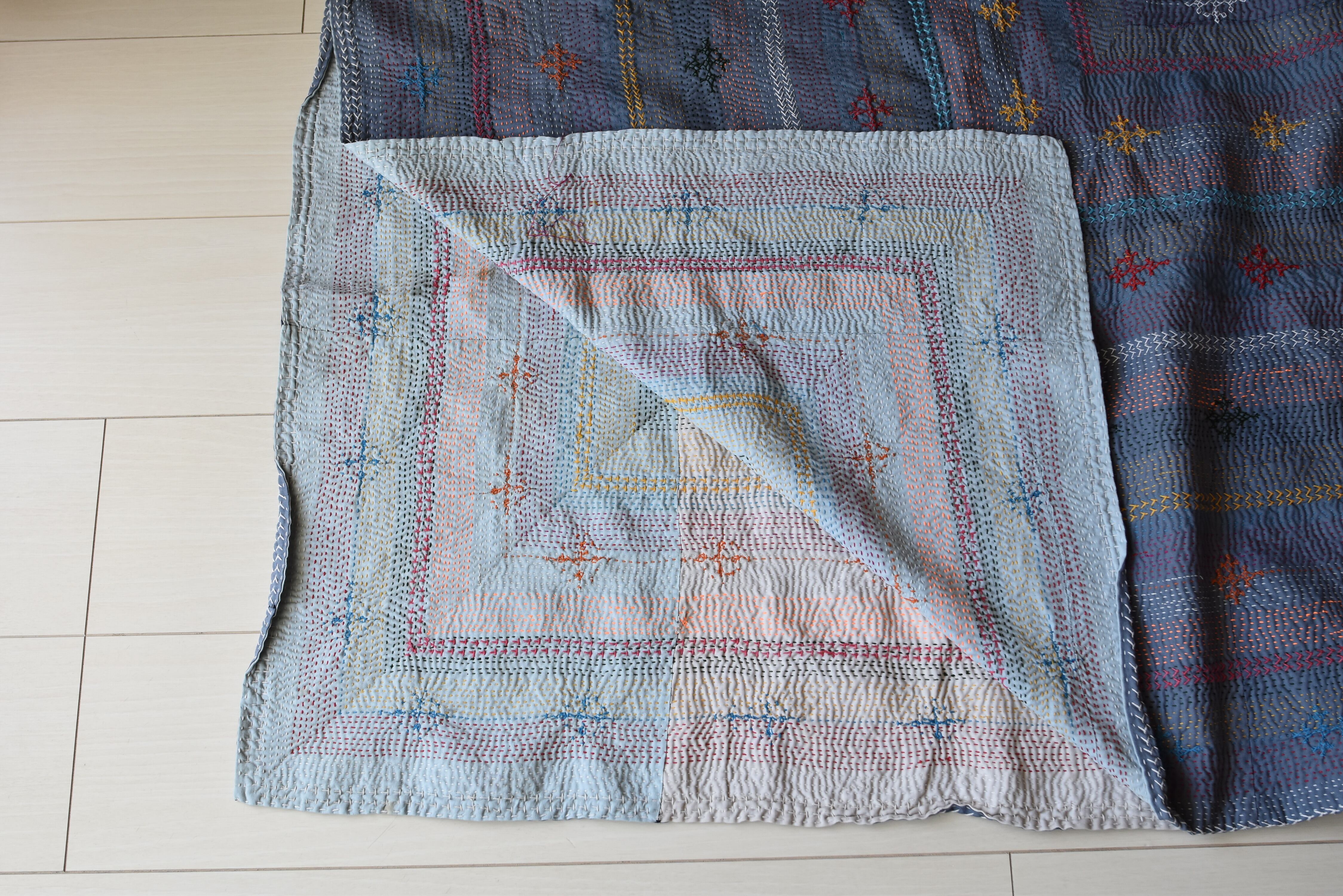 サミキルトとはインドやパキスタンを移動する遊牧民サーミ族の人々によって作られた、キルトです。キルト全体に細かい刺繍が規則正しく施されています。近年サミキルトの人気が高くなる一方、このような精緻な刺繍を施すことができる人は少なくなり、希少性が高まっています。