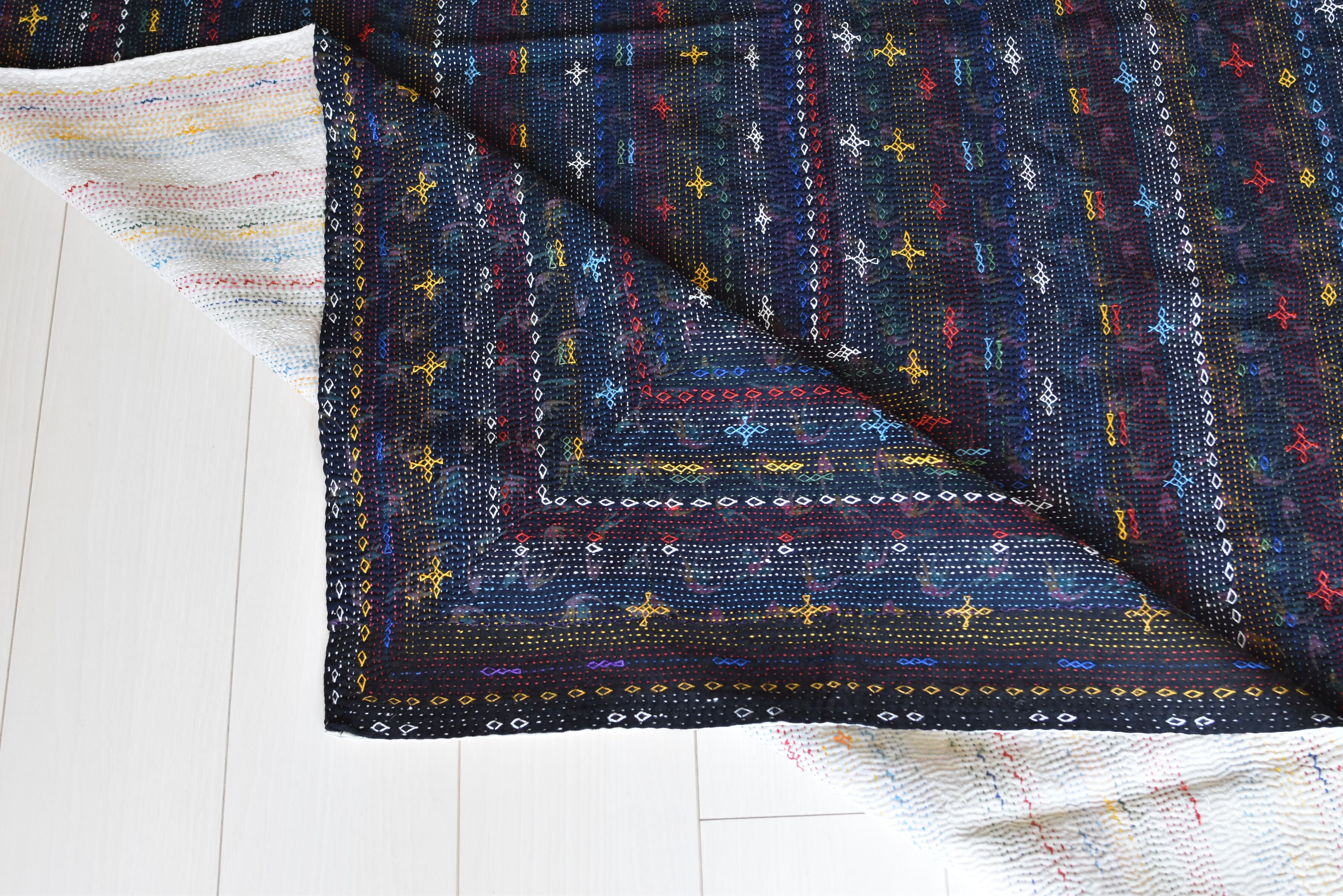 うっすら模様がついた黒いキルトに、カラフルな原色系の色糸で、細かいスティッチがとても丁寧に施されています。シンプルですがとても整った端正な顔立ちをしていて、キルトのゆがみもほとんどありません。薄手で柔らかく軽い、少し小さめのキルトです。