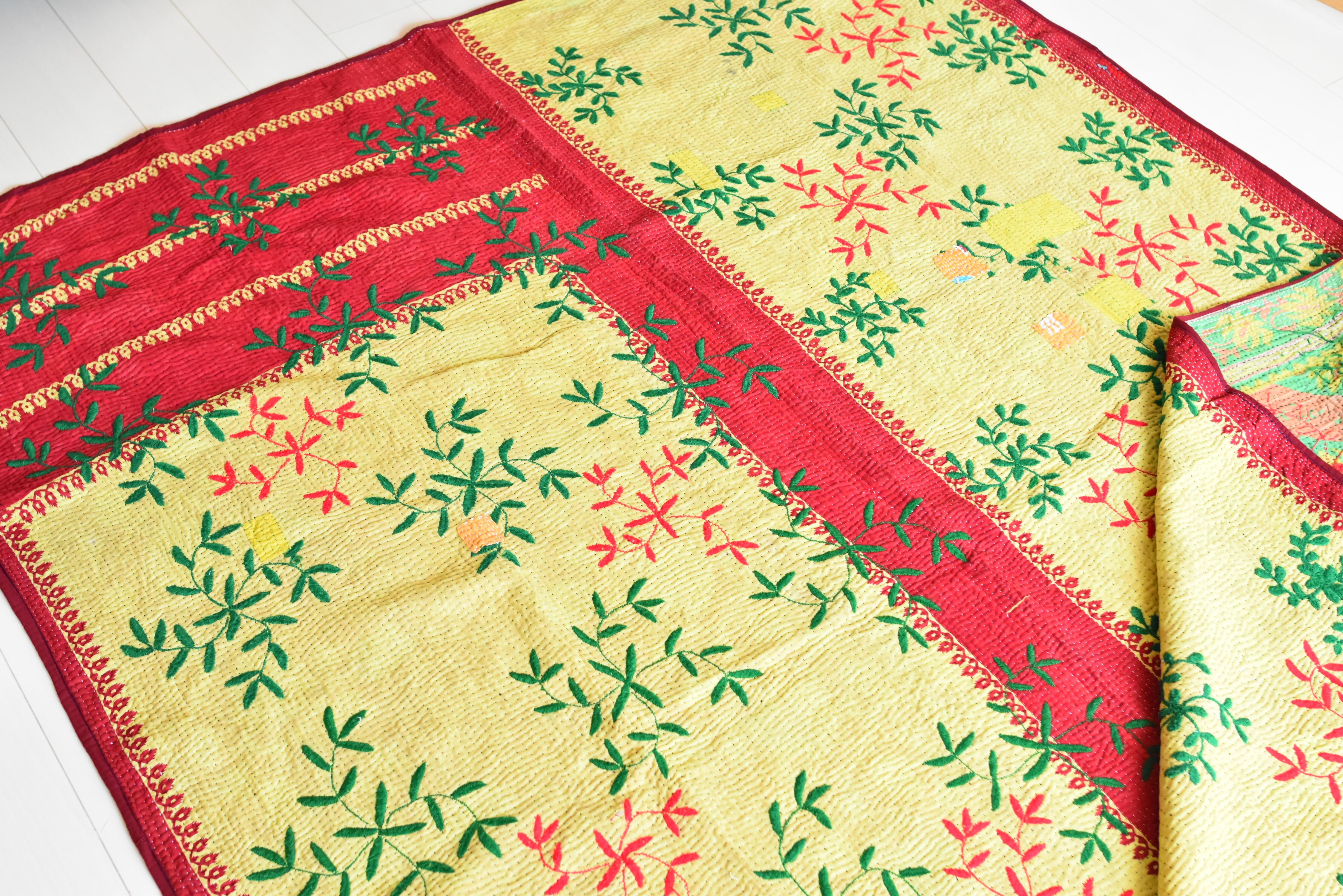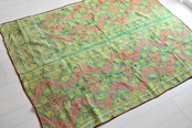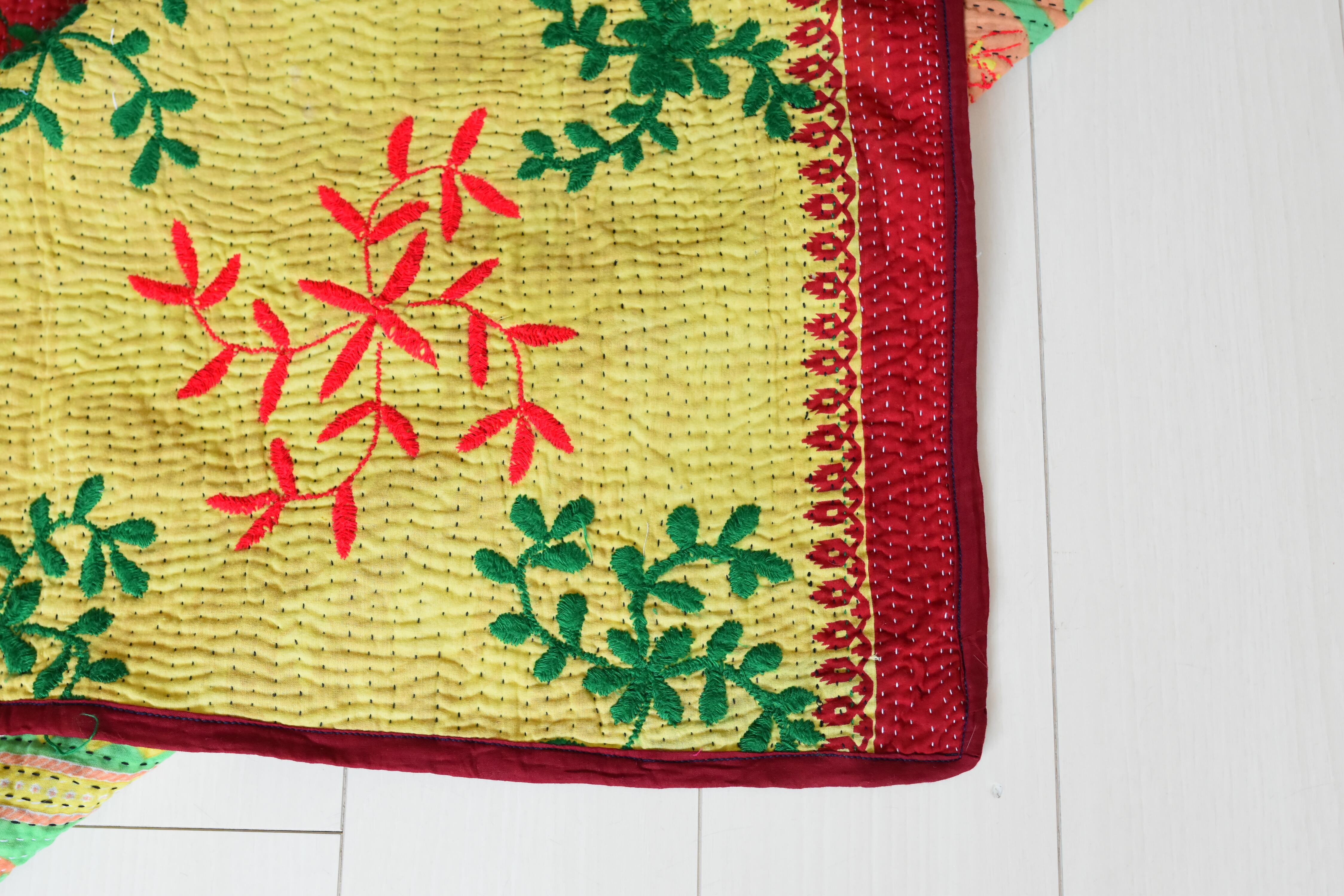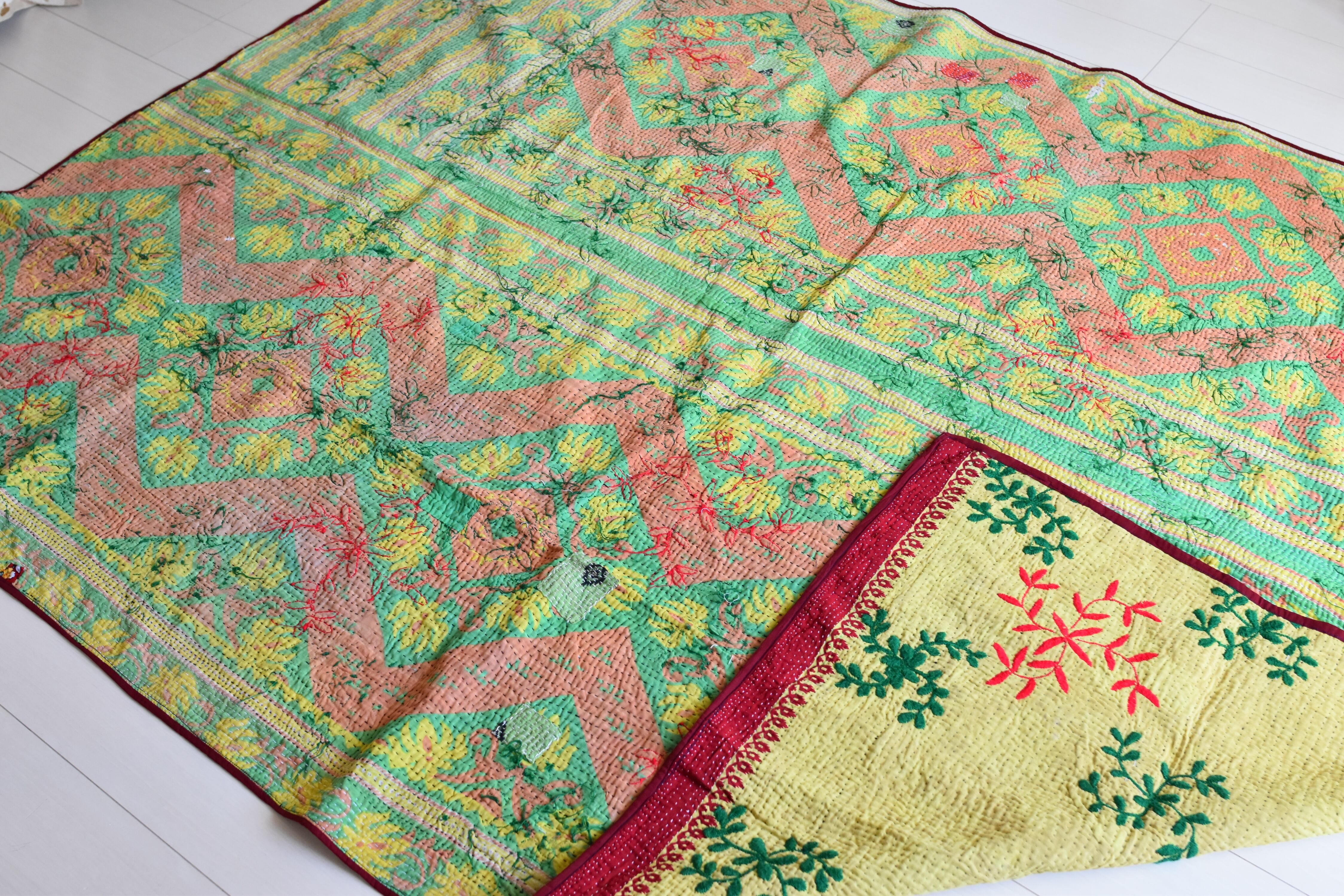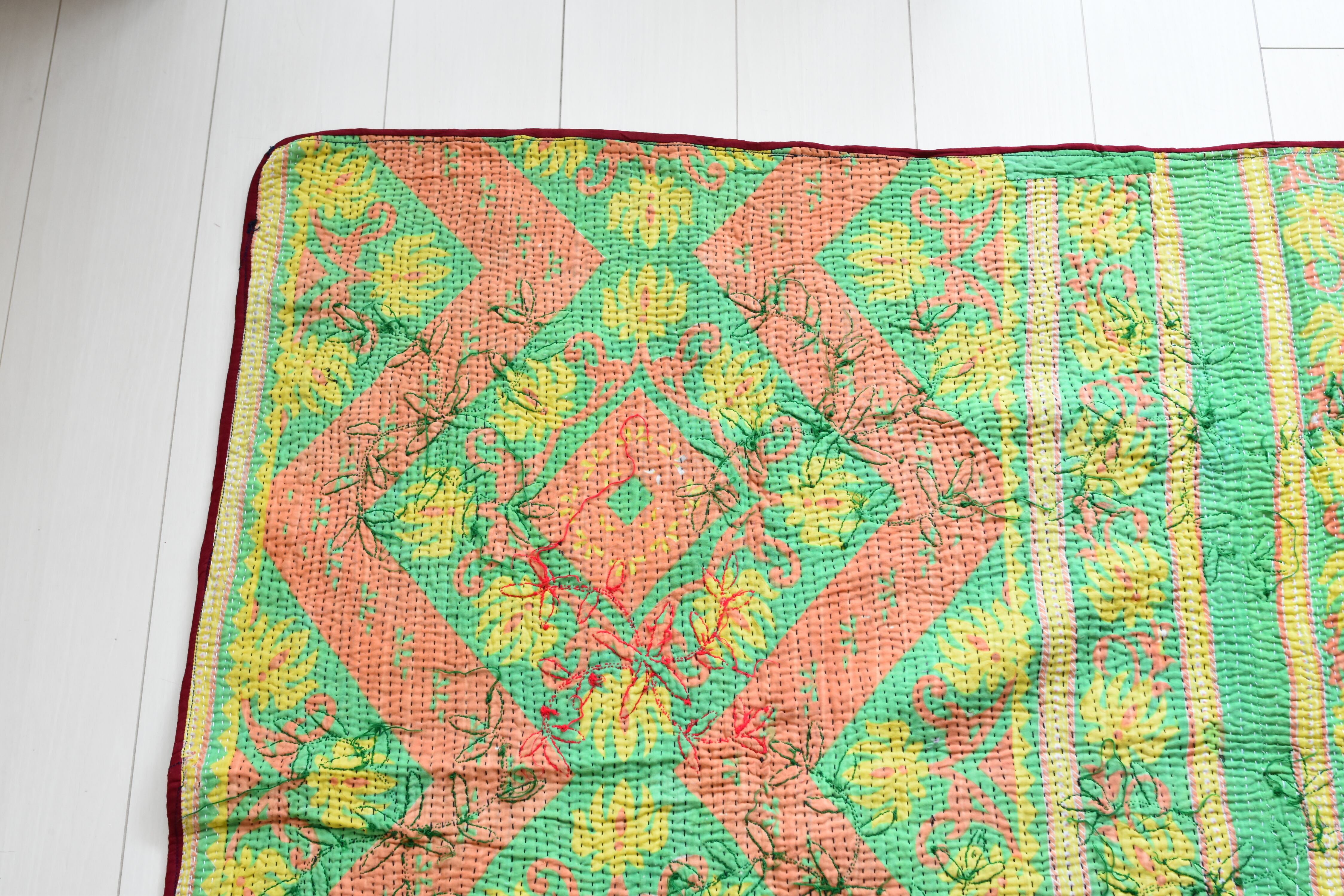 パッと明るく、一枚あるだけで心がポジティブになりそうなカンタキルトです。赤と緑の植物刺繍は躍動感があって少し風車のようです。大判で厚みがあり、ラグ向きの一枚です。これからの季節、こたつにも良いと思います。
