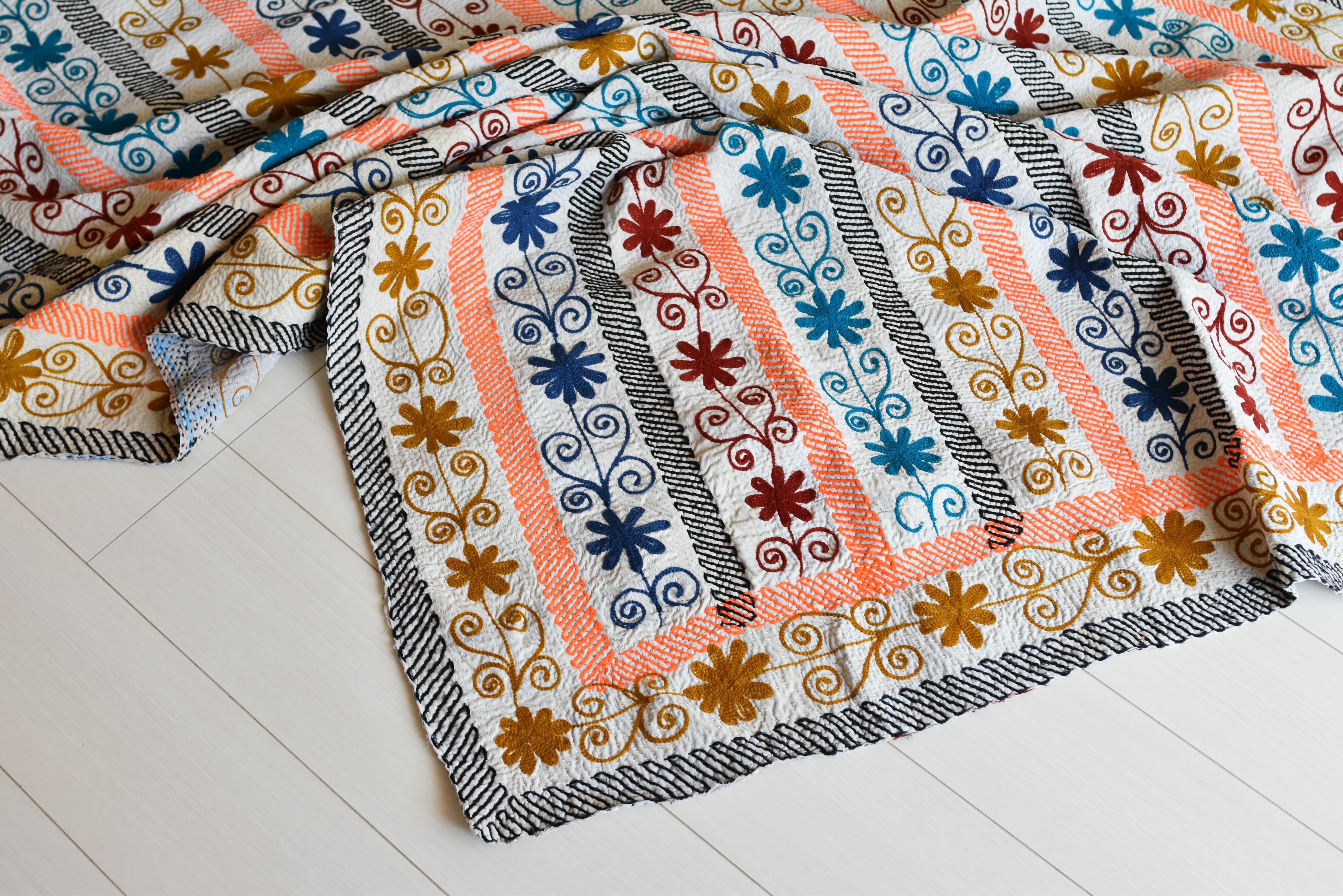 アースカラーの色糸で施されたお花模様の刺繍がとてもハンサム!一見カラフルなのに、黒のラインスティッチが引き締まった印象を与えて全体的に大人っぽくまとまっています。地の色は真っ白ではなく生成り色のような色味をしています。中厚手でしっかりとした一枚です。